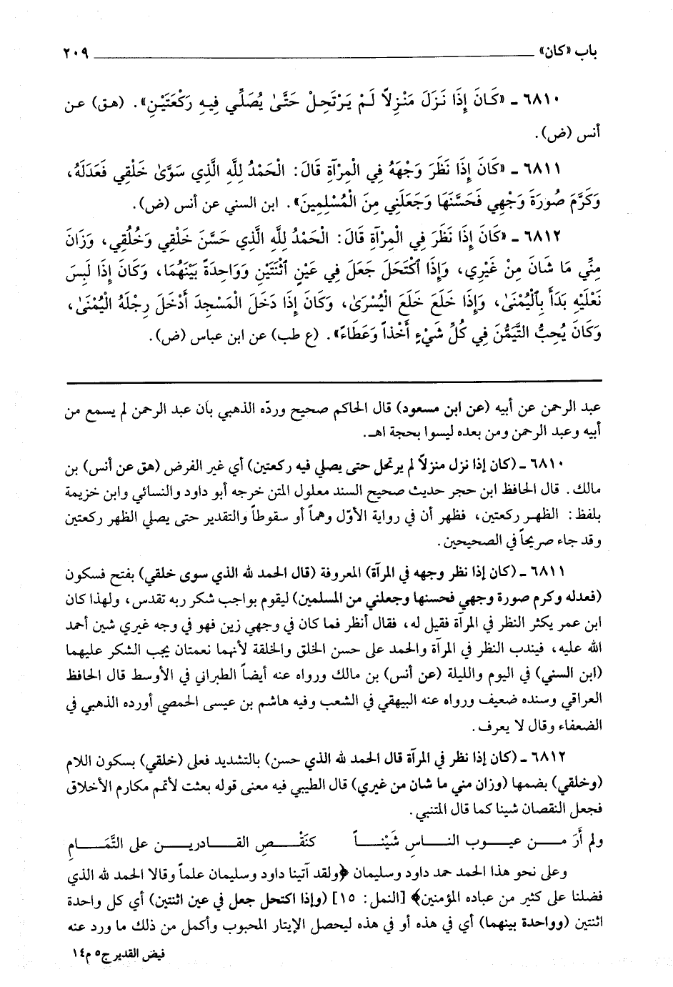 6811 - (كان إذا نظر وجهه في المرآة) المعروفة (قال الحمد لله الذي سوى خلقي) بفتح فسكون (فعدله وكرم صورة وجهي فحسنها وجعلني من المسلمين) ليقوم بواجب شكر ربه تقدس ، ولهذا كان ابن عمر يكثر النظر في المرآة فقيل له ، فقال أنظر فما كان في وجهي زين فهو في وجه غيري شين أحمد الله عليه ، فيندب النظر في المرآة والحمد على حسن الخلق والخلقة لأنهما نعمتان يجب الشكر عليهما.