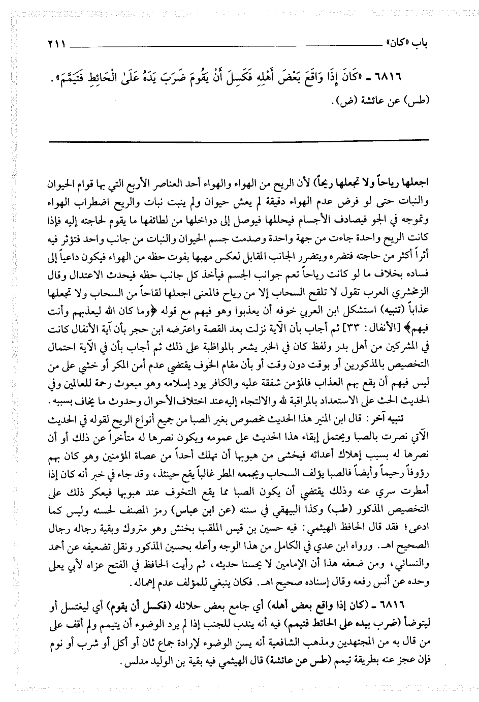 6816 - (كان إذا وقع بعض أهله) أي جامع بعض حلائله (فكسل أن يقوم) أي ليغتسل أو ليتوضأ (ضرب بيده على الحائط فتيمم) فيه أنه يندب للجنب إذا لم يرد الوضوء أن يتيمم ولم أقف على من قال به من المجتهدين ومذهب الشافعية أنه يسن الوضوء لإرادة جماع ثان أو أكل أو شرب أو نوم فإن عجز عنه بطريقه تيمم.