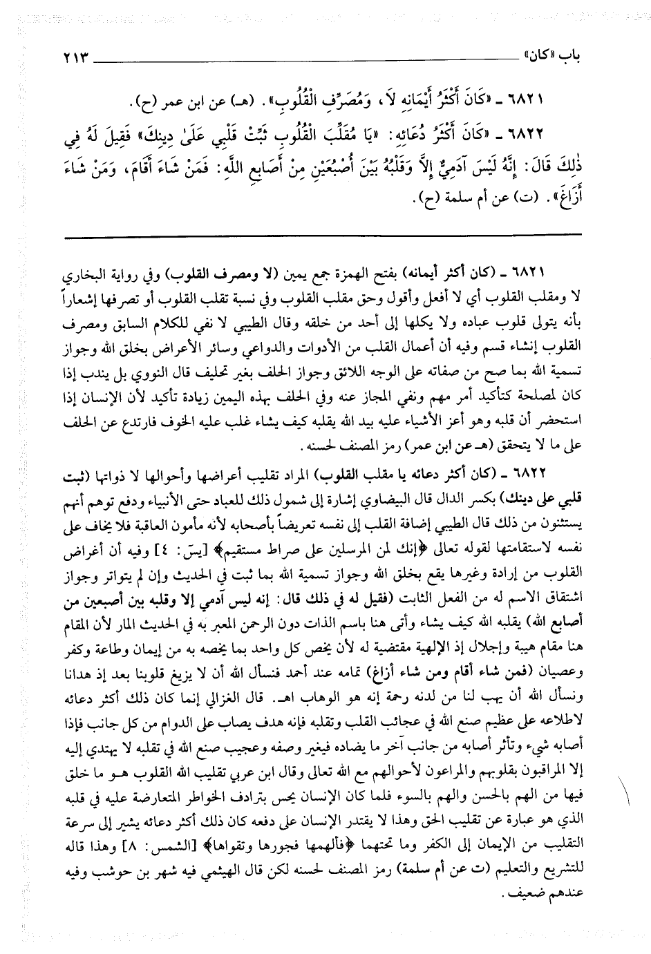 6822 - (كان أكثر دعائه يا مقلب القلوب) المراد تقليب أعراضها وأحوالها لا ذواتها (ثبت قلبي على دينك) بكسر الدال قال البيضاوي : إشارة إلى شمول ذلك للعباد حتى الأنبياء ودفع توهم أنهم يستثنون من ذلك قال الطيبي : إضافة القلب إلى نفسه تعريضا بأصحابه لأنه مأمون العاقبة فلا يخاف على