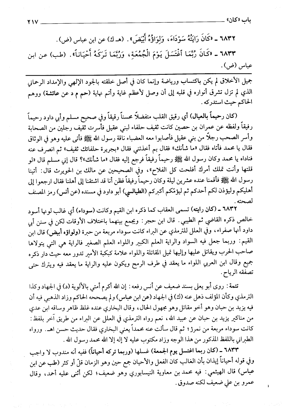 6832 - (كان رايته) تسمى العقاب كما ذكره ابن القيم وكانت (سوداء) أي غالب لونها أسود خالص ذكره القاضي ثم الطيبي.