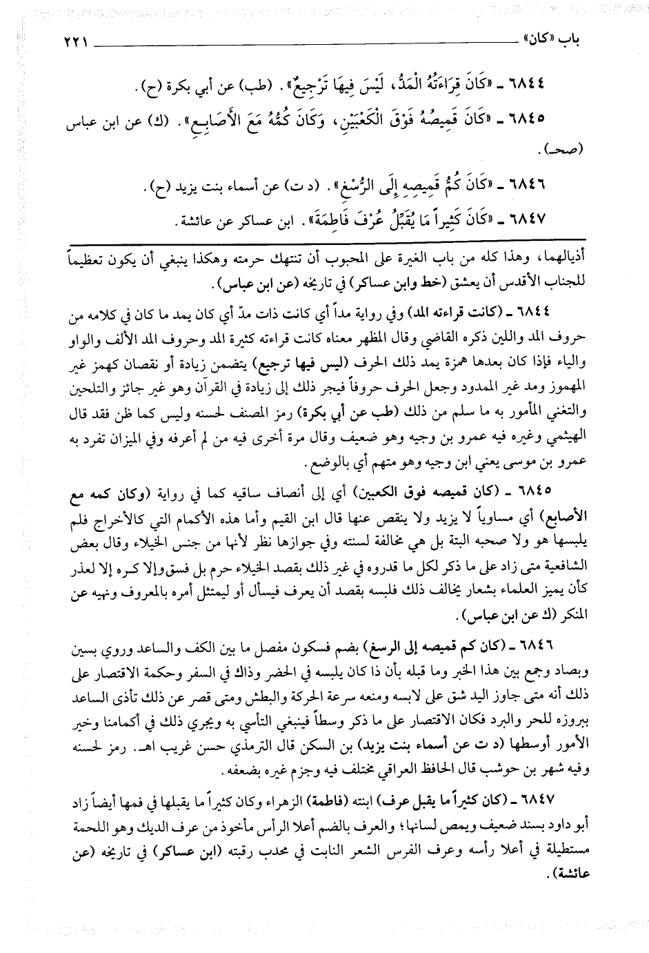 6846 - (كان كم قميصه إلى الرسغ) بضم فسكون مفصل ما بين الكف والساعد وروي بسين
