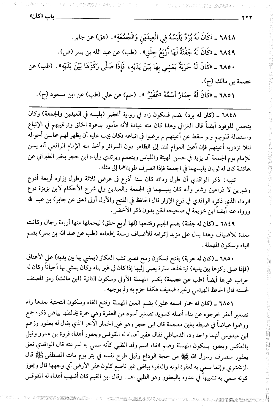 تنبيه : ذكر الواقدي أن طول ردائه كان ستة أذرع في عرض ثلاثة وطول إزاره أربعة أذرع وشبرين لا ذراعين وشبر وأنه كان يلبسهما في الجمعة والعيدين وفي شرح الأحكام لابن بزيزة ذرع الرداء الذي ذكره الواقدي في ذرع الإزار قال الحافظ في الفتح : والأول أولى.