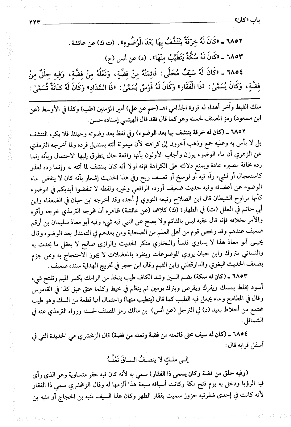 6854 - (كان له سيف محلى قائمته من فضة ونعله من فضة) قال الزمخشري: هي الحديدة التي في أسفل قرابه قال: * إلى ملك لا ينصف الساق نعله * (وفيه حلق من فضة وكان يسمى ذا الفقار) سمي به لأنه كان فيه حفر متساوية وهو الذي رأى فيه الرؤيا ودخل به يوم فتح مكة وكانت أسيافه سبعة هذا ألزمها له، وقال الزمخشري: سمي ذا الفقار لأنه كانت في إحدى شفرتيه حزوز سميت بفقار الظهر وكان هذا السيف لمنبه بن الحجاج أو منبه بن