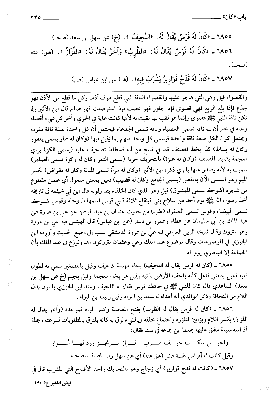 6855 - (كان له فرس يقال له اللحيف) بحاء مهملة كرغيف وقيل بالتصغير سمي به لطول ذنبه فعيل بمعنى فاعل كأنه يلحف الأرض بذنبه وقيل هو بخاء معجمة وقيل بجيم.