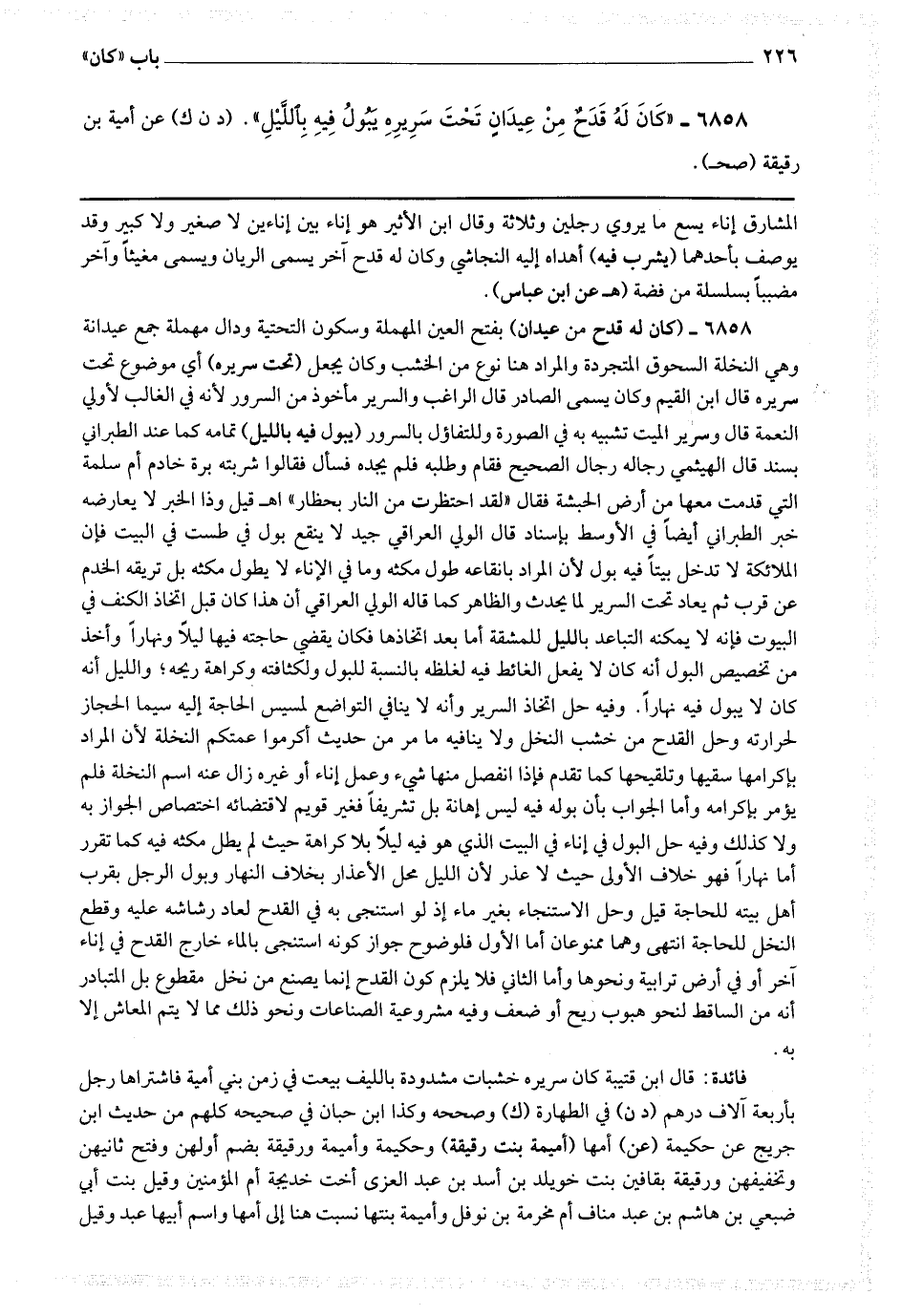 6858 - (كان له قدح من عيدان) بفتح العين المهملة وسكون التحتية ودال مهملة جمع عيدانة وهي النخلة السحوق المتجردة والمراد هنا نوع من الخشب وكان يجعل (تحت سريره) أي موضوع تحت سريره قال ابن القيم: وكان يسمى الصادر قال الراغب: والسرير مأخوذ من السرور لأنه في الغالب لأولي النعمة قال: وسرير الميت تشبيه به في الصورة وللتفاؤل بالسرور (يبول فيه بالليل) تمامه كما عند الطبراني بسند قال الهيثمي: رجاله رجال الصحيح فقام وطلبه فلم يجده فسأل فقالوا: شربته برة خادم أم سلمة التي قدمت معها من أرض الحبشة فقال: لقد احتظرت من النار بحظار اه.