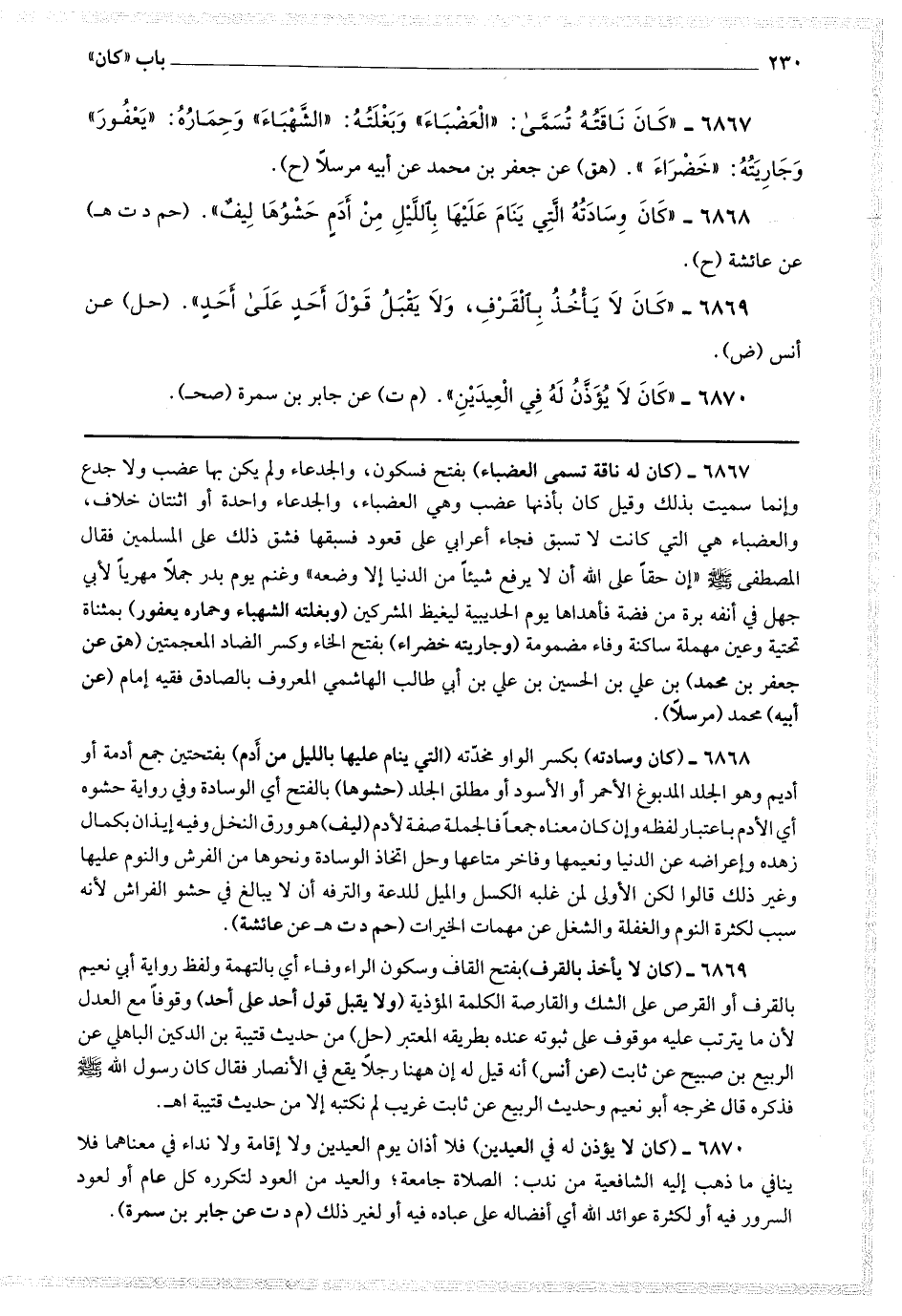 6867 - (كان له ناقة تسمى العضباء) بفتح فسكون، والجدعاء ولم يكن بها عضب ولا جدع وإنما سميت بذلك وقيل كان بأذنها عضب وهي العضباء، والجدعاء واحدة أو اثنتان خلاف، والعضباء هي التي كانت لا تسبق فجاء أعرابي على قعود فسبقها فشق ذلك على المسلمين فقال المصطفى صلى الله عليه وسلم: إن حقا على الله أن لا يرفع شيئا من الدنيا إلا وضعه [ص 181] وغنم يوم بدر جملا مهريا لأبي جهل في أنفه برة من فضة فأهداها يوم الحديبية ليغيظ المشركين (وبغلته الشهباء وحماره يعفور) بمثناة تحتية وعين مهملة ساكنة وفاء مضمومة (وجاريته خضرة) بفتح الخاء وكسر الضاد المعجمتين.