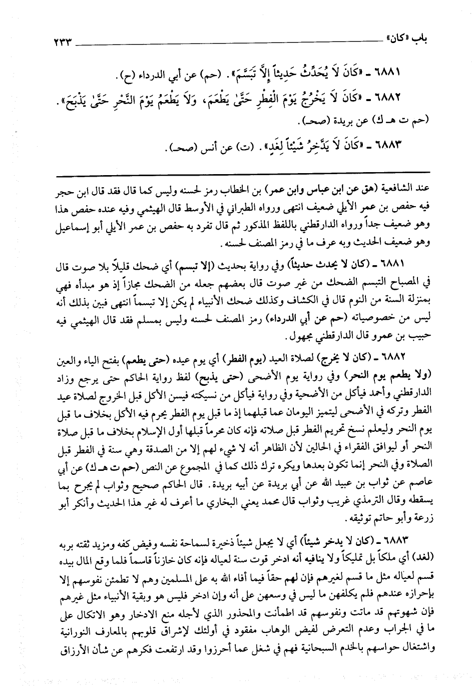 6881 - (كان لا يحدث حديثا) وفي رواية بحديث (إلا تبسم) أي ضحك قليلا بلا صوت.