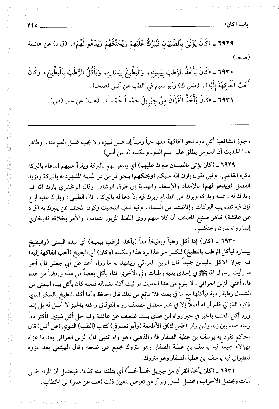 قال الزين العراقي: ويشهد له ما رواه أحمد عن أبي جعفر قال آخر: ما رأيت رسول الله صلى الله عليه وسلم في إحدى يديه رطبات وفي الأخرى قثاء يأكل بعضا من هذه وبعضا من هذه قال أعني الزين العراقي: ولا يلزم من هذا الحديث لو ثبت أكله بشماله فلعله كان يأكل بيده اليمنى من الشمال رطبة رطبة فيأكلها مع ما في يمينه فلا مانع من ذلك قال الحافظ: وأما أكله البطيخ بالسكر الذي ذكره الغزالي فلم أر له أصلا إلا في خبر معضل مضعف رواه التوقاني وأكله بالخبز لا أصل له [ص 193] بل إنما ورد أكل العنب بالخبز في خبر رواه ابن عدي بسند ضعيف عن عائشة وفيه حل أكل شيئين فأكثر معا ومنه جمعه بين زبد ولبن وتمر.
