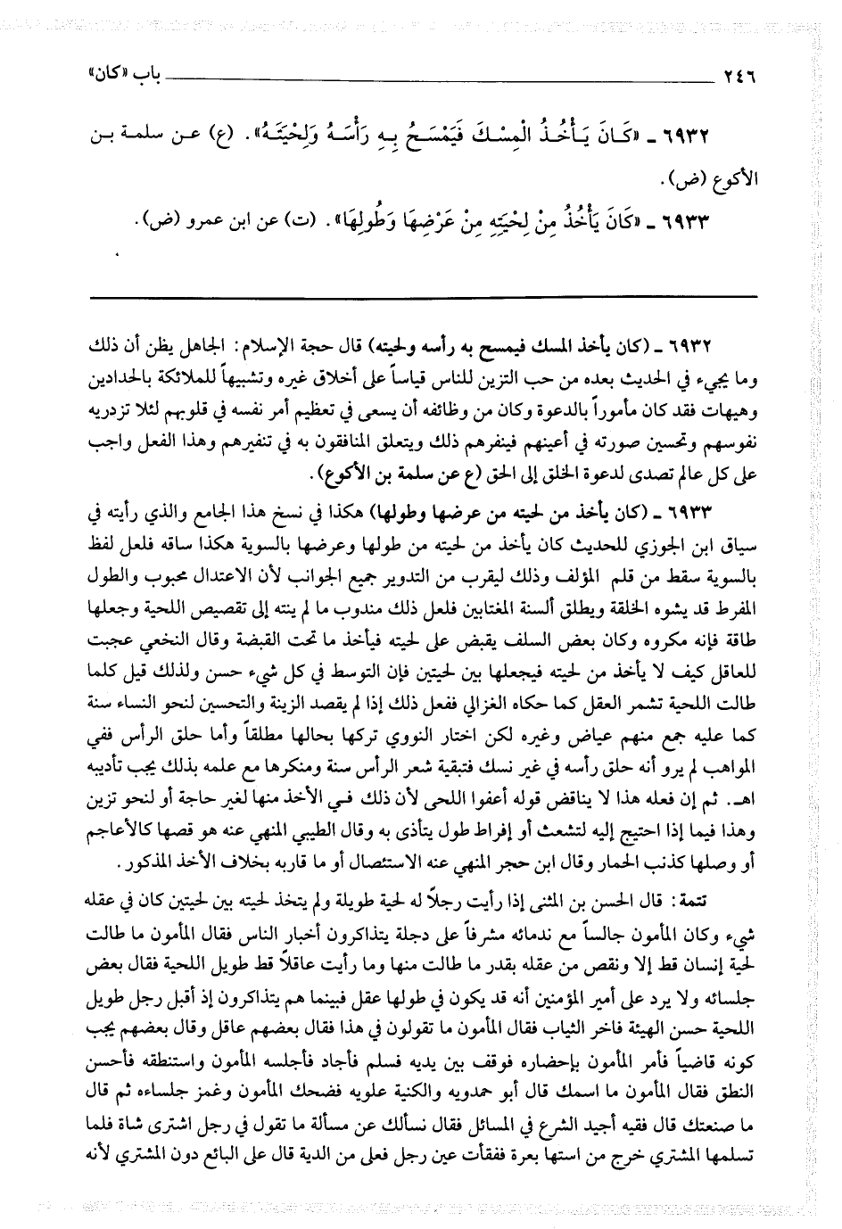 6933 - (كان يأخذ من لحيته من عرضها وطولها) هكذا في نسخ هذا الجامع والذي رأيته في سياق ابن الجوزي للحديث كان يأخذ من لحيته من طولها وعرضها بالسوية هكذا ساقه فلعل لفظ بالسوية سقط من قلم المؤلف وذلك ليقرب من التدوير جميع الجوانب لأن الاعتدال محبوب والطول المفرط قد يشوه الخلقة ويطلق ألسنة المغتابين فلعل ذلك مندوب ما لم ينته إلى تقصيص اللحية وجعلها طاقة فإنه مكروه وكان بعض السلف يقبض على لحيته فيأخذ ما تحت القبضة وقال النخعي: عجبت للعاقل كيف لا يأخذ من لحيته فيجعلها بين لحيتين فإن التوسط في كل شئ حسن ولذلك قيل كلما طالت اللحية تشمر العقل كما حكاه الغزالي ففعل ذلك إذا لم يقصد الزينة والتحسين لنحو النساء سنة كما عليه جمع منهم عياض وغيره لكن اختار النووي تركها بحالها مطلقا وأما حلق الرأس ففي المواهب لم يرو أنه حلق رأسه في غير نسك فتبقية شعر الرأس سنة ومنكرها مع علمه بذلك يجب تأديبه اه.