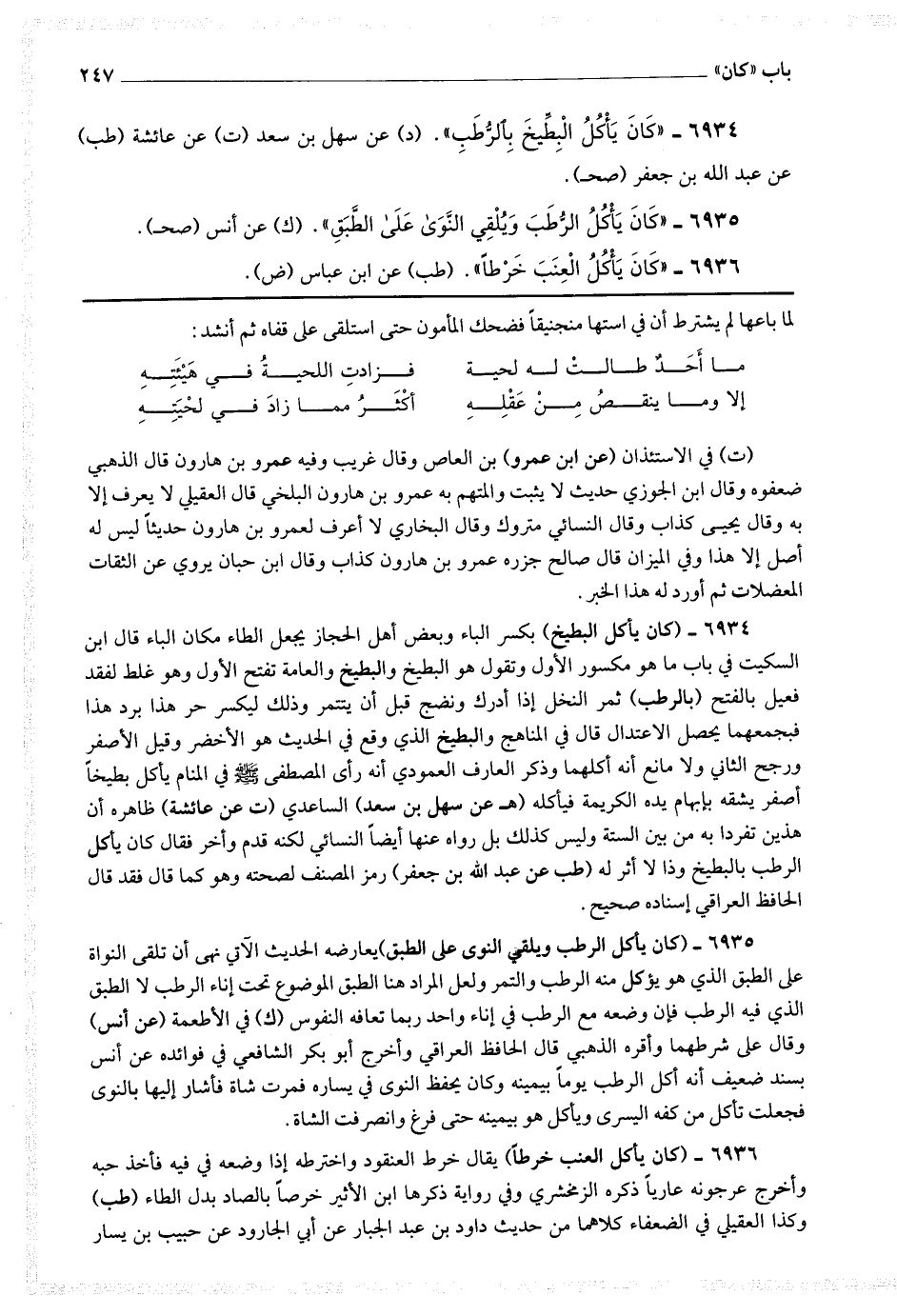 6935 - (كان يأكل الرطب ويلقي النوى على الطبق) يعارضه الحديث الآتي نهى أن تلقى النواة على الطبق الذي يؤكل منه الرطب والتمر ولعل المراد هنا الطبق الموضوع تحت إناء الرطب لا الطبق الذي فيه الرطب فإن وضعه مع الرطب في إناء واحد ربما تعافه النفوس.