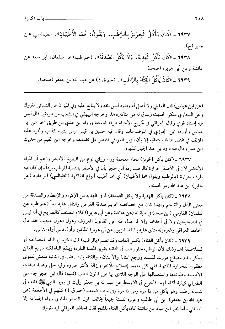 (تنبيه) قال ابن حجر: جاء عن الطبراني كيفية أكله لهما فأخرج في الأوسط عن عبد الله بن جعفر: رأيت في يمين النبي صلى الله عليه وسلم قثاء وفي شماله رطب وهو يأكل من ذا مرة ومن ذا مرة وفي سنده ضعف.