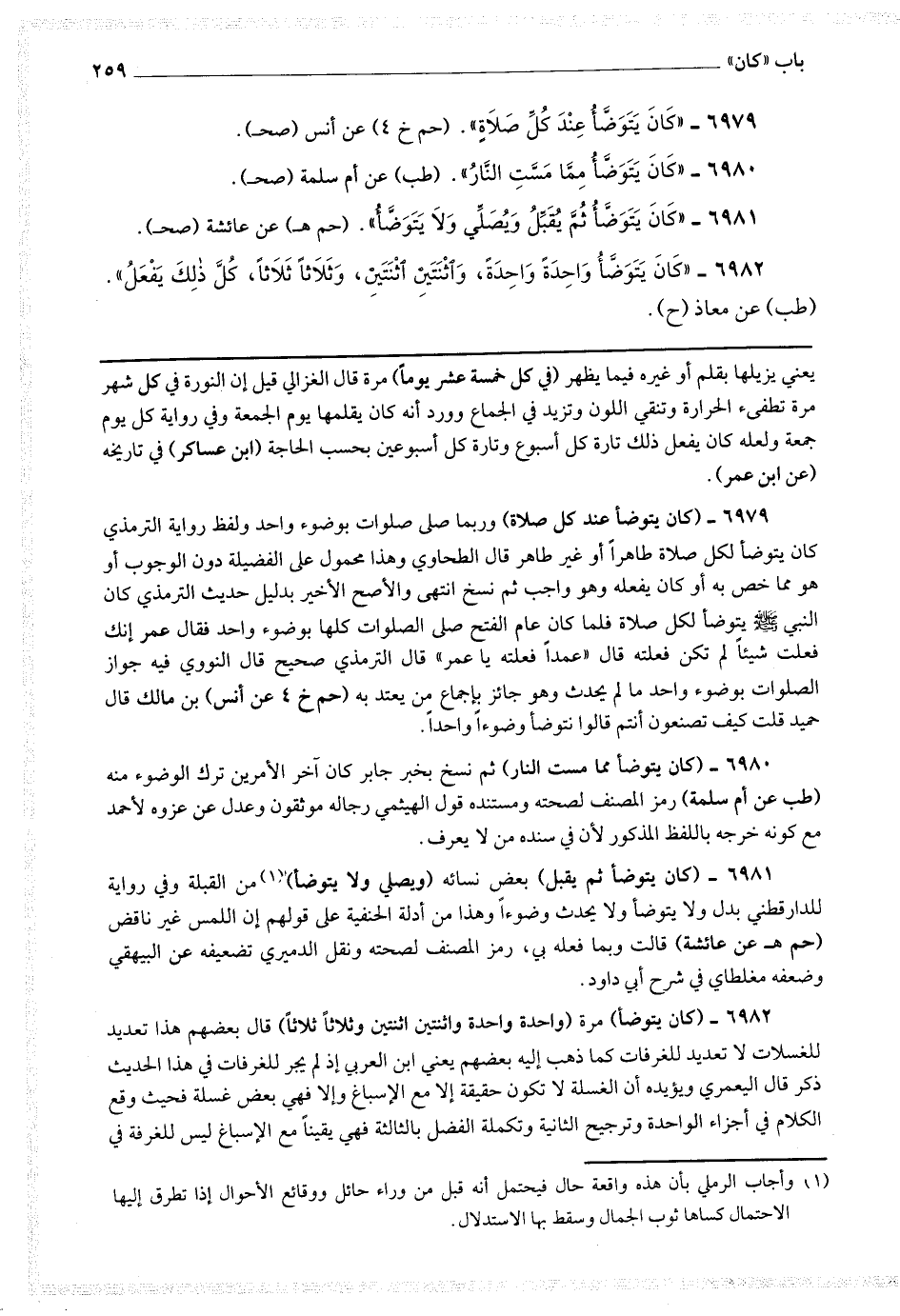 6979 - (كان يتوضأ عند كل صلاة) وربما صلى صلوات بوضوء واحد ولفظ رواية الترمذي