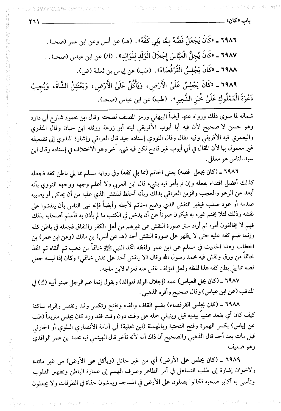 6989 - (كان يجلس على الأرض) أي من غير حائل (ويأكل على الأرض) من غير مائدة