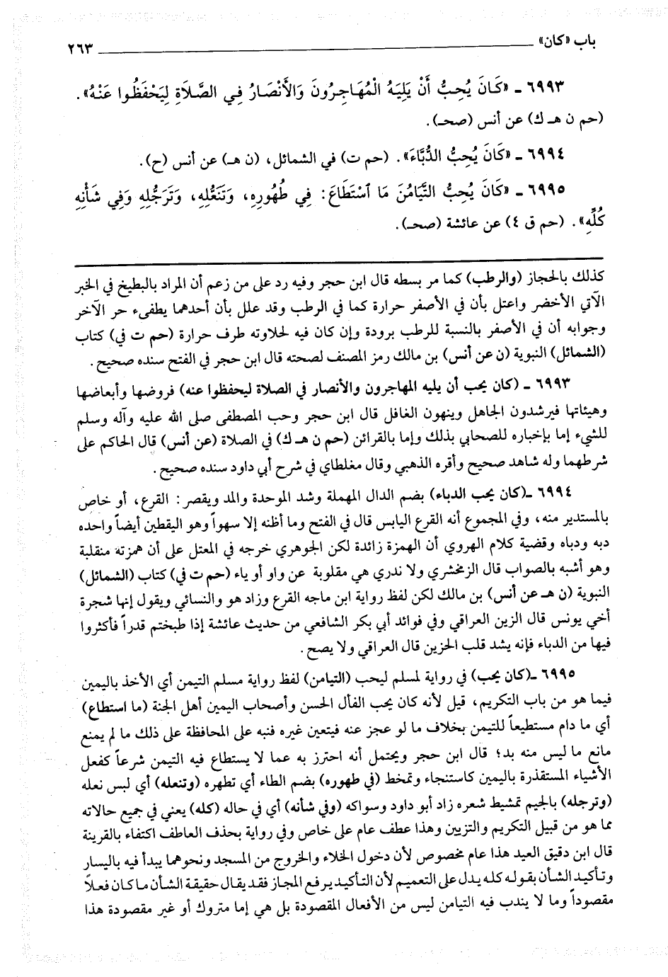 6995 - (كان يحب) في رواية لمسلم ليحب (التيامن) لفظ رواية مسلم التيمن أي الأخذ باليمين فيما هو من باب التكريم قيل لأنه كان يحب الفأل الحسن وأصحاب اليمين أهل الجنة (ما استطاع) أي ما دام مستطيعا للتيمن بخلاف ما لو عجز عنه فيتعين غيره فنبه على المحافظة على ذلك ما لم يمنع مانع ما ليس منه بد قال ابن حجر: ويحتمل أنه احترز به عما لا يستطاع فيه التيمن شرعا كفعل الأشياء المستقذرة ياليمين كاستنجاء وتمخط (في طهوره) بضم الطاء أي تطهره (وتنعله) أي ليس نعله (وترجله) بالجيم تمشيط شعره زاد أبو داود وسواكه (وفي شأنه) أي في حاله (كله) يعني في جميع حالاته مما هو من قبيل التكريم والتزيين وهذا عطف عام على خاص وفي رواية بحذف العاطف اكتفاء بالقرينة قال ابن دقيق العيد: هذا عام مخصوص لأن دخول الخلاء والخروج من المسجد ونحوهما يبدأ فيه باليسار وتأكيد الشأن بقوله كله يدل على التعميم لأن التأكيد يرفع المجاز فقد يقال حقيقة الشأن ما كان فعلا مقصودا وما لا يندب فيه التيامن ليس من الأفعال المقصودة بل هي إما متروك أو غير مقصودة هذا