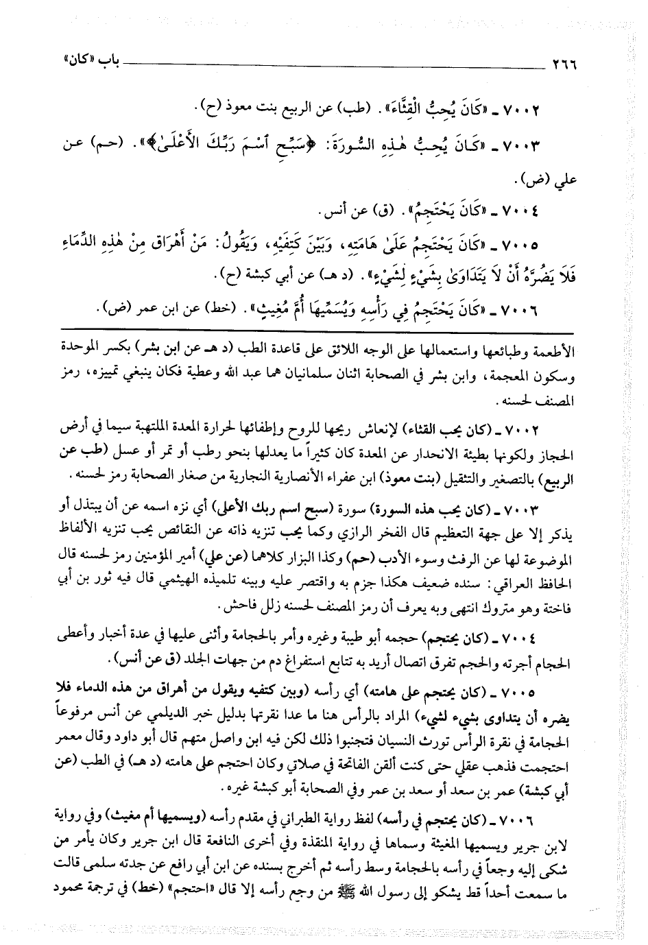 7004 - (كان يحتجم) حجمه أبو طيبة وغيره وأمر بالحجامة وأثنى عليها في عدة أخبار وأعطى الحجام أجرته والحجم تفرق اتصال أريد به تتابع استفراغ دم من جهات الجلد.