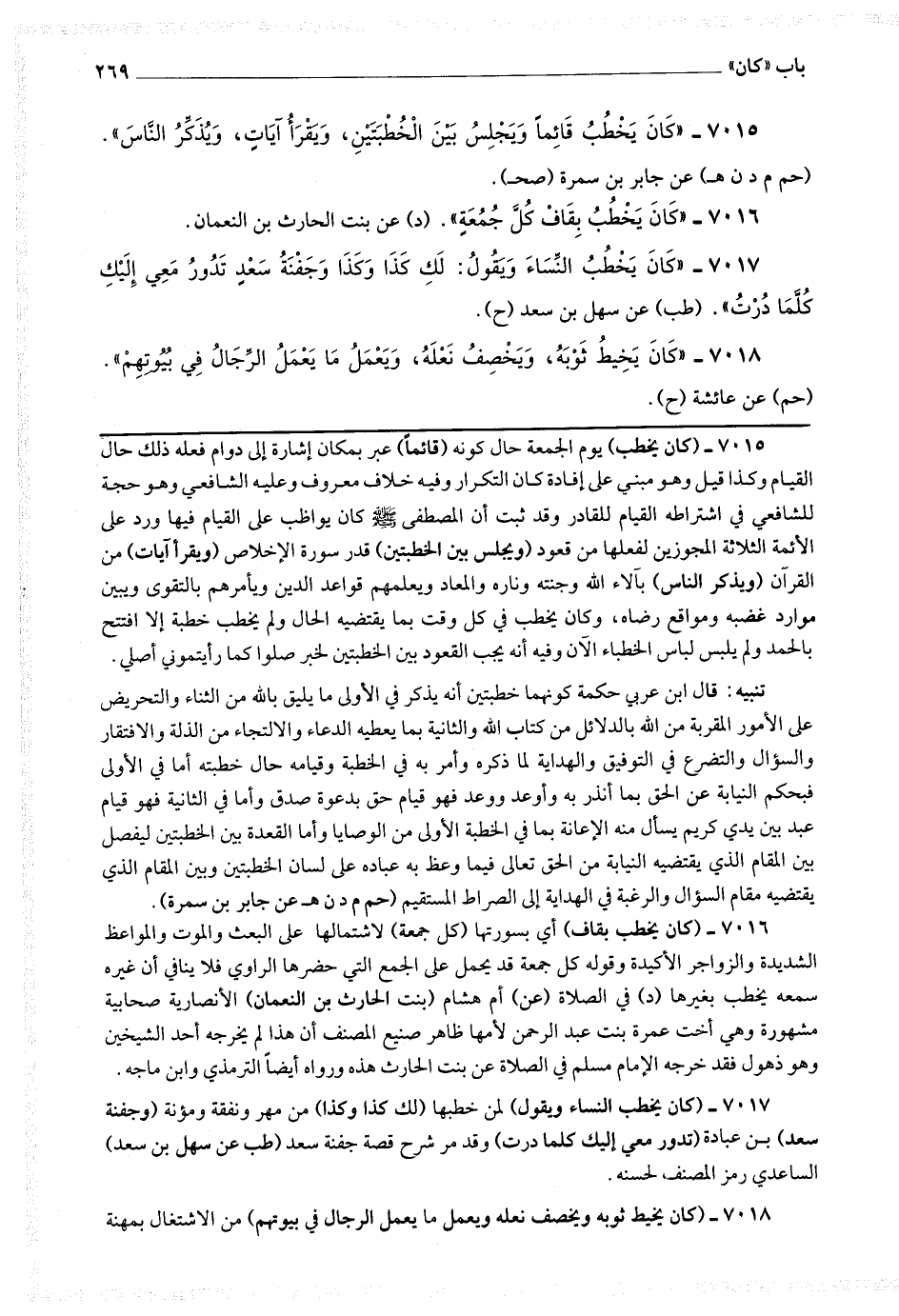 7015 - (كان يخطب) يوم الجمعة حال كونه (قائما) عبر بكان إشارة إلى دوام فعله ذلك حال القيام وكذا قيل وهو مبني على إفادة كان التكرار وفيخلاف معروف وعليه الشافعي وهو حجة للشافعي في اشتراطه القيام للقادر وقد ثبت أن المصطفى صلى الله عليه وسلم كان يواظب على القيام فيها ورد على الأئمة الثلاثة المجوزين لفعلها من قعود (ويجلس بين الخطبتين) قدر سورة الإخلاص (ويقرأ آيات) من القرآن (ويذكر الناس) بآلاء الله وجنته وناره والمعاد ويعلمهم قواعد الدين ويأمرهم بالتقوى ويبين موارد غضبه ومواقع رضاه، وكان يخطب في كل وقت بما يقتضيه الحال ولم يخطب خطبة إلا افتتح بالحمد ولم يلبس لباس الخطباء الآن وفيه أنه يجب القعود بين الخطبتين لخبر صلوا كما رأيتموني أصلي.