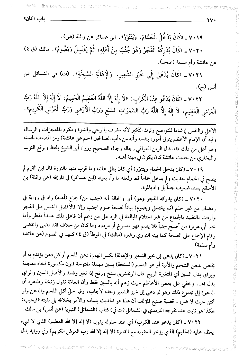 7022 - (كان يدعو عند الكرب) أي عند حلوله يقول (لا إله إلا الله العظيم) الذي لا شئ يعظم عليه (الحليم) الذي يؤخر العقوبة مع القدرة (لا إله إلا الله رب العرش العظيم) وفي رواية بدل