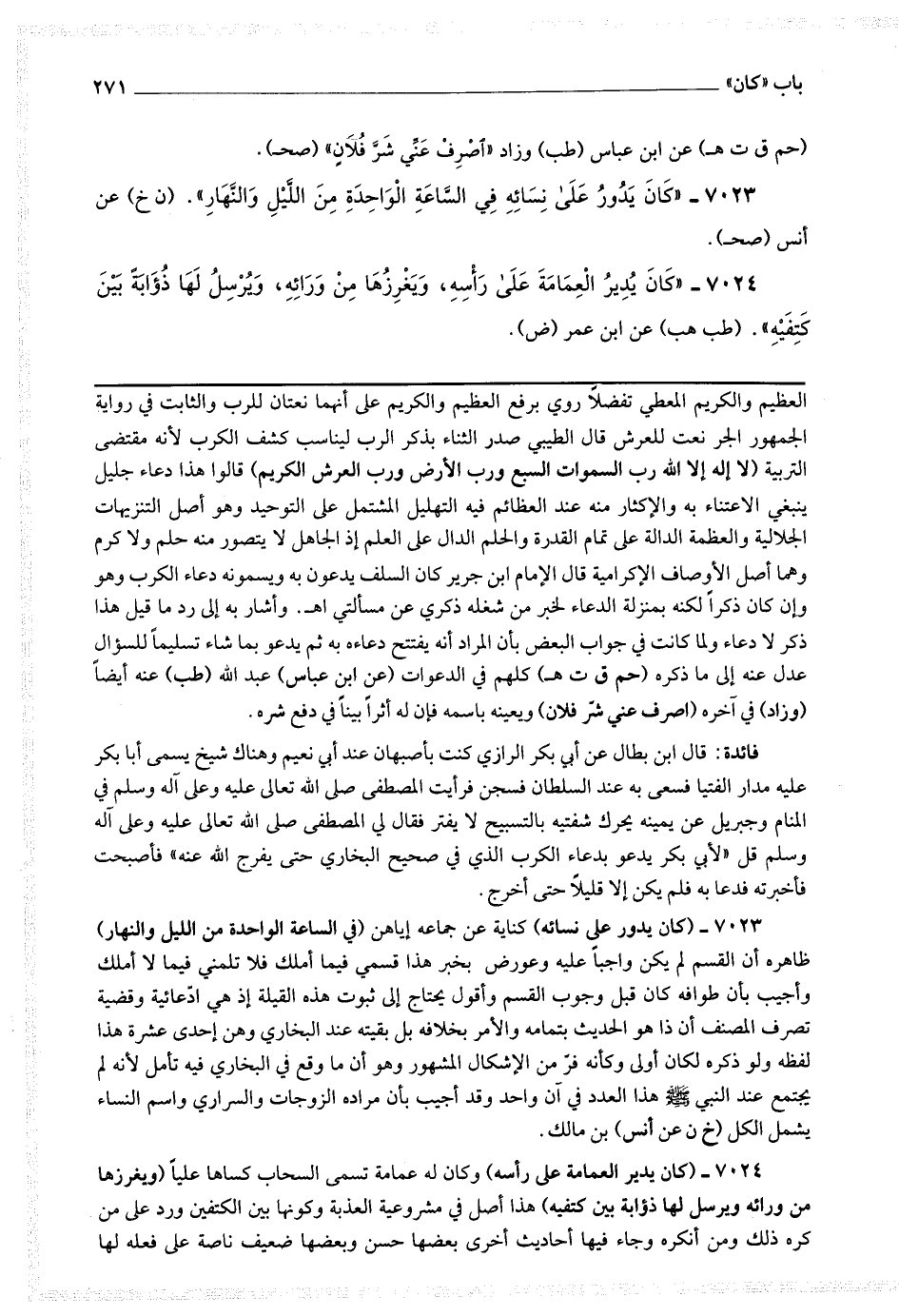 7023 - (كان يدور على نسائه) كناية عن جماعه إياهن (في الساعة الواحدة من الليل والنهار) ظاهره أن القسم لم يكن واجبا عليه وعورض بخبر هذا قسمي فيما أملك فلا تلمني فيما لا أملك وأجيب بأن طوافه كان قبل وجوب القسم وأقول: يحتاج إلى ثبوت هذه القيلة إذ هي ادعائية وقضية تصرف المصنف أن ذا هو الحديث بتمامه والأمر بخلافه بل بقيته عند البخاري وهن إحدى عشرة هذا لفظه ولو ذكره لكان أولى وكأنه فر من الإشكال المشهور وهو أن ما وقع في البخاري فيه تأمل لأنه لم يجتمع عند النبي صلى الله عليه وسلم هذا العدد في آن واحد وقد أجيب بأن مراده الزوجات والسراري واسم النساء يشمل الكل.