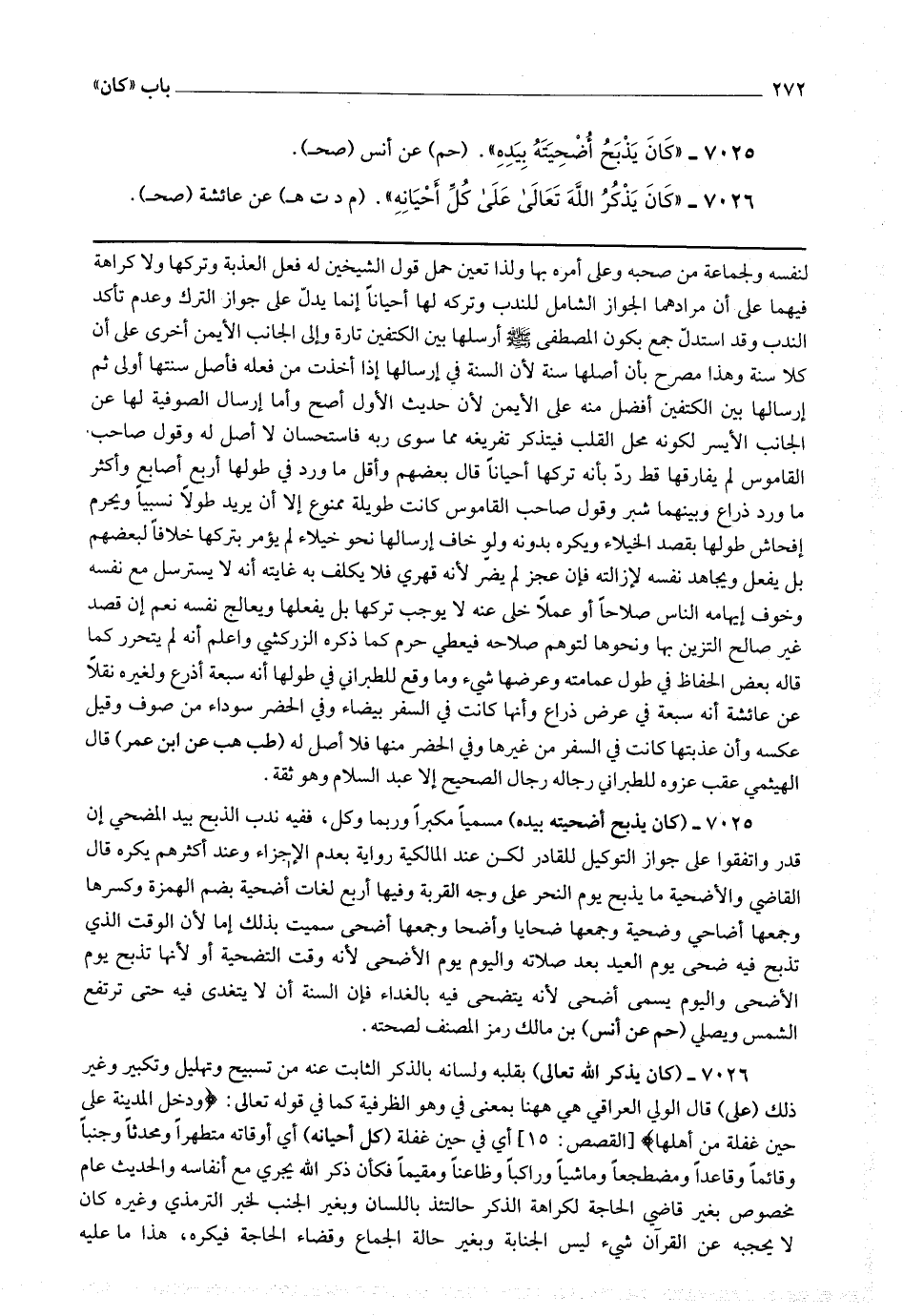 7025 - (كان يذبح أضحيته بيده) مسميا مكبرا وربما وكل، ففيه ندب الذبح بيد المضحي إن قدر واتفقوا على جواز التوكيل للقادر لكن عند المالكية رواية بعدم الإجزاء وعند أكثرهم يكره قال القاضي: والأضحية ما يذبح يوم النحر على وجه القربة وفيها أربع لغات أضحية بضم الهمزة وكسرها وجمعها أضاحي وضحية وجمعها ضحايا وأضحا وجمعها أضحى سميت بذلك إما لأن الوقت الذي تذبح فيه ضحى يوم العيد بعد صلاته واليوم يوم الأضحى لأنه وقت التضحية أو لأنها تذبح يوم الأضحى واليوم يسمى أضحى لأنه يتضحى فيه بالغداء فإن السنة أن لا يتغدى فيه حتى ترتفع الشمس ويصلي.