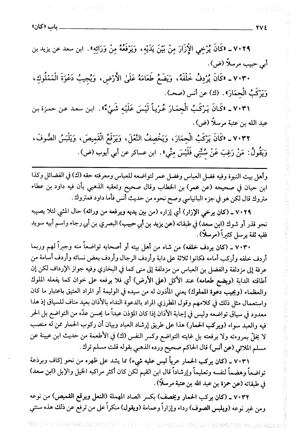 7032 - (كان يركب الحمار ويخصف) بكسر الصاد المهملة (النعل ويرقع القميص) من نوعه ومن غير نوعه (ويلبس الصوف) رداء وإزارا وعمامة (ويقول) منكرا على من ترفع عن ذلك هذه سنتي