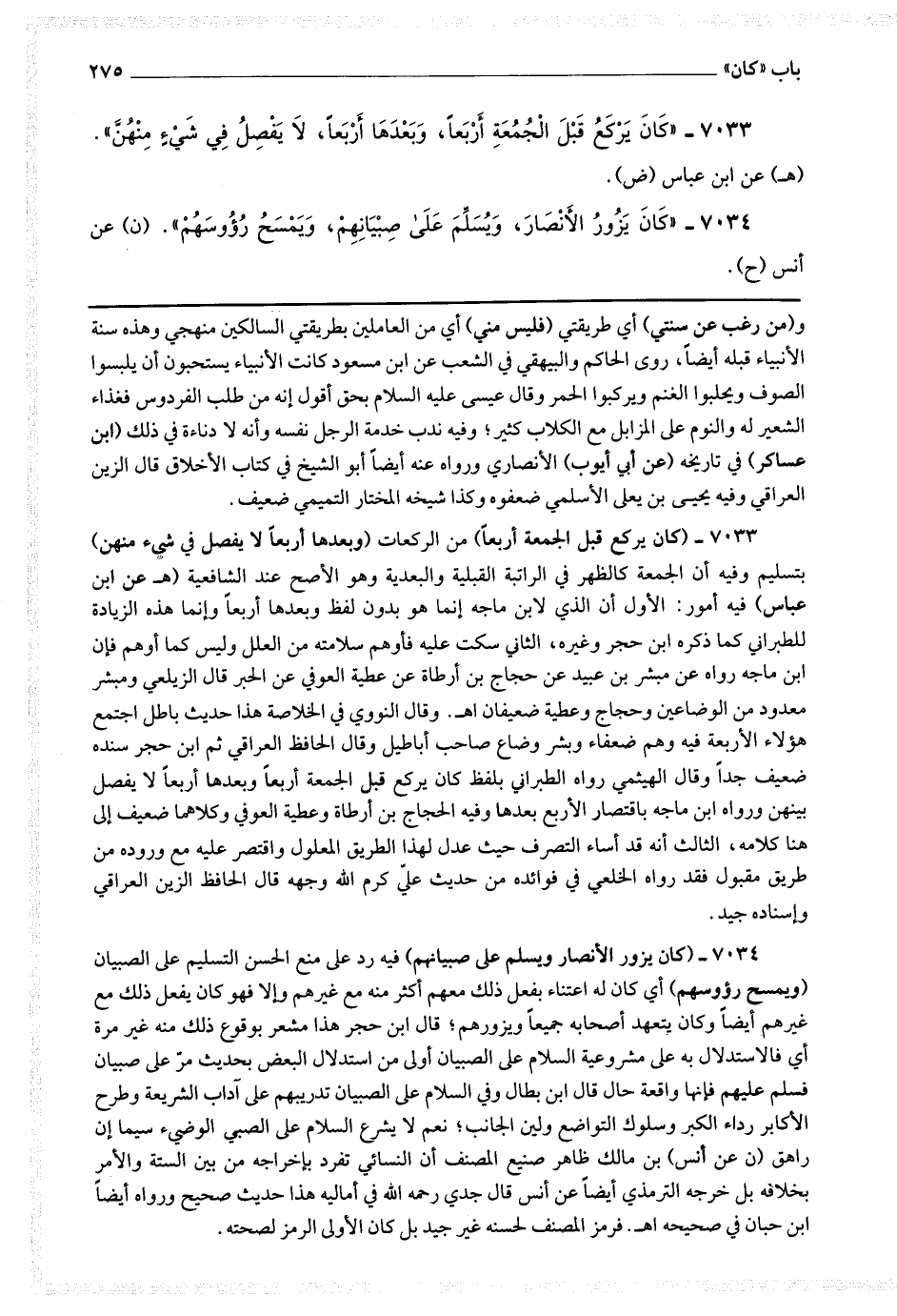 7033 - (كان يركع قبل الجمعة أربعا) من الركعات (وبعدها أربعا لا يفصل في شئ منهن) بتسليم وفيه أن الجمعة كالظهر في الراتبة القبلية والبعدية وهو الأصح عند الشافعية.