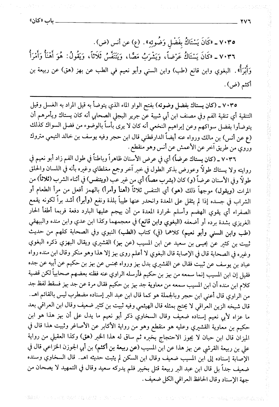 قال شيخه الزين العراقي: لا يحتج بمثله قال الهيثمي: وفيه ثبيت بن كثير ضعيف وقال ابن العراقي بعد ما عزاه لأبي نعيم: إسناده ضعيف وقال السخاوي: ذكر أبو نعيم ما يدل على أن بهز هذا هو ابن حكيم بن معاوية القشيري وعليه هو منقطع وهو من رواية الأكابر عن الأصاغر وثبيت هذا قال في الميزان: قال ابن حبان لا يجوز الاحتجاج بخبره ثم ساق له هذا الخبر (هق) وكذا العقيلي من رواية علي بن ربيعة القرشي عن بهز هذا عن ابن المسيب (عن ربيعة بن أكثم) بن أبى الجوزن الخزاعي قال في الإصابة: إسناده إلى ابن المسيب ضعيف وقال ابن السكن: لم يثبت حديثه اه.