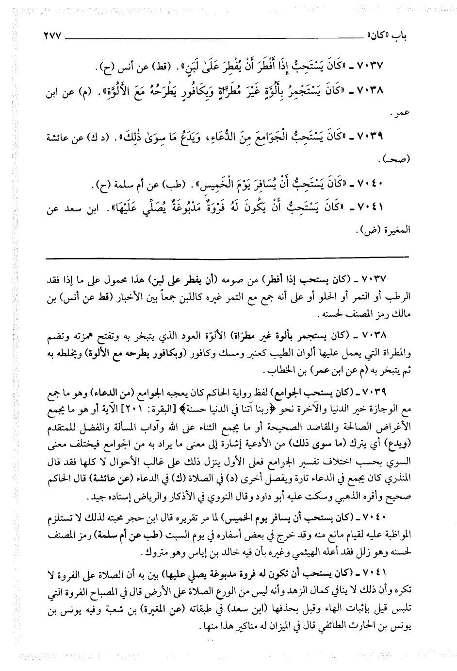7037 - (كان يستحب إذا أفطر) من صومه (أن يفطر على لبن) هذا محمول على ما إذا فقد الرطب أو التمر أو الحلو أو على أنه جمع مع التمر غيره كاللبن جمعا بين الأخبار.