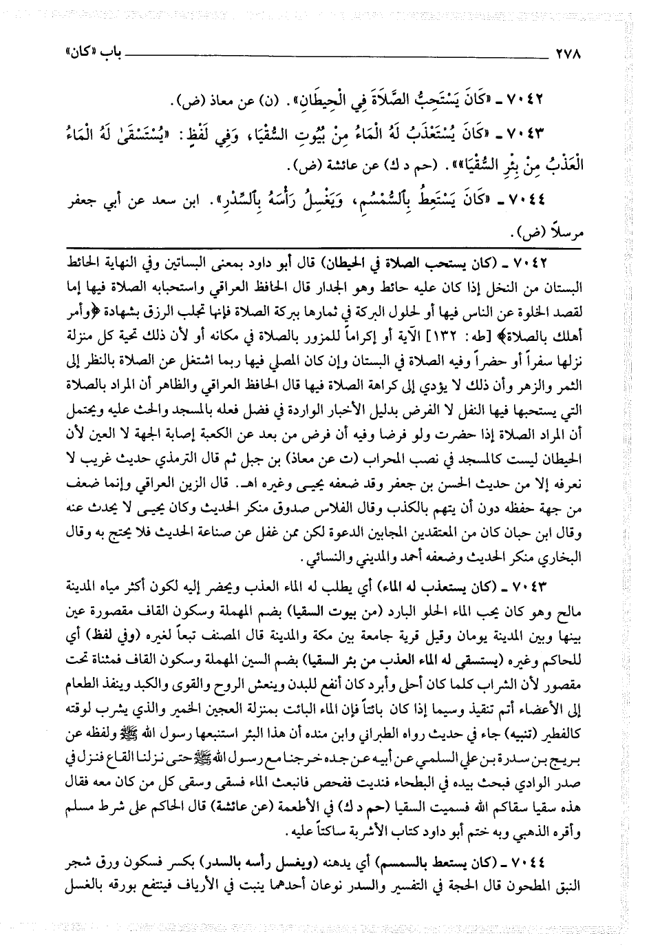 7042 - (كان يستحب الصلاة في الحيطان) قال أبو داود: بمعنى البساتين وفي النهاية الحائط البستان من النخل إذا كان عليه حائط وهو الجدار قال الحافظ العراقي: واستحبابه الصلاة فيها إما لقصد الخلوة عن الناس فيها أو لحلول البركة في ثمارها ببركة الصلاة فإنها تجلب الرزق بشهادة * (وأمر أهلك بالصلاة) * الآية أو إكراما للمزور بالصلاة في مكانه أو لأن ذلك تحية كل منزلة نزلها سفرا أو حضرا وفيه الصلاة في البستان وإن كان المصلى فيها ربما اشتغل عن الصلاة بالنظر إلى
