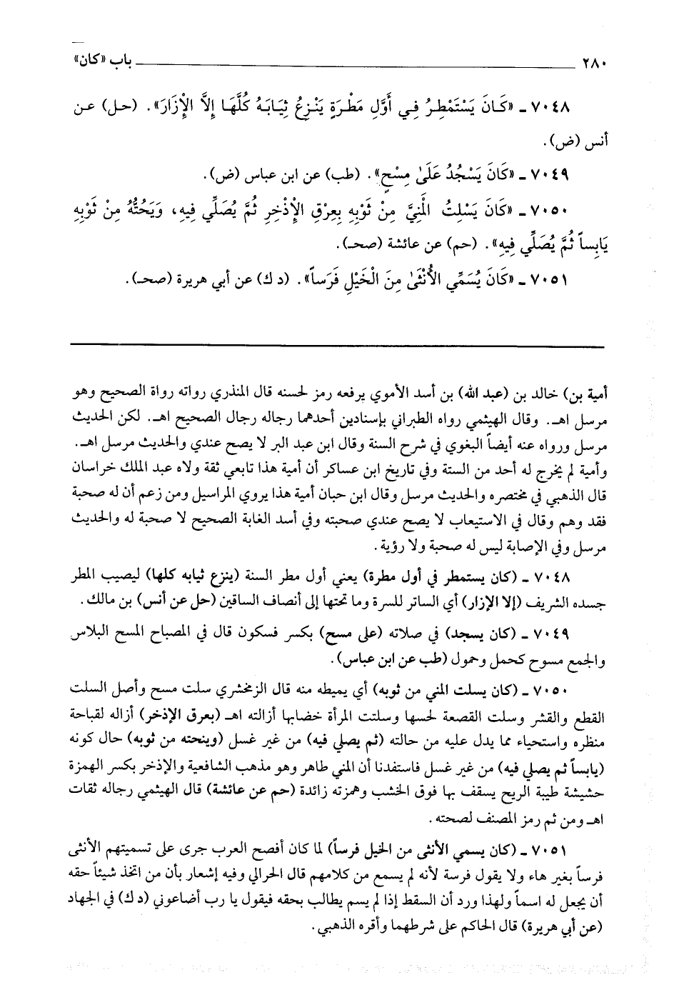 7051 - (كان يسمي الأنثى من الخيل فرسا) لما كان أفصح العرب جرى على تسميتهم الأنثى فرسا بغير هاء ولا يقول فرسة لأنه لم يسمع من كلامهم قال الحرالي: وفيه إشعار بأن من اتخذ شيئا حقه