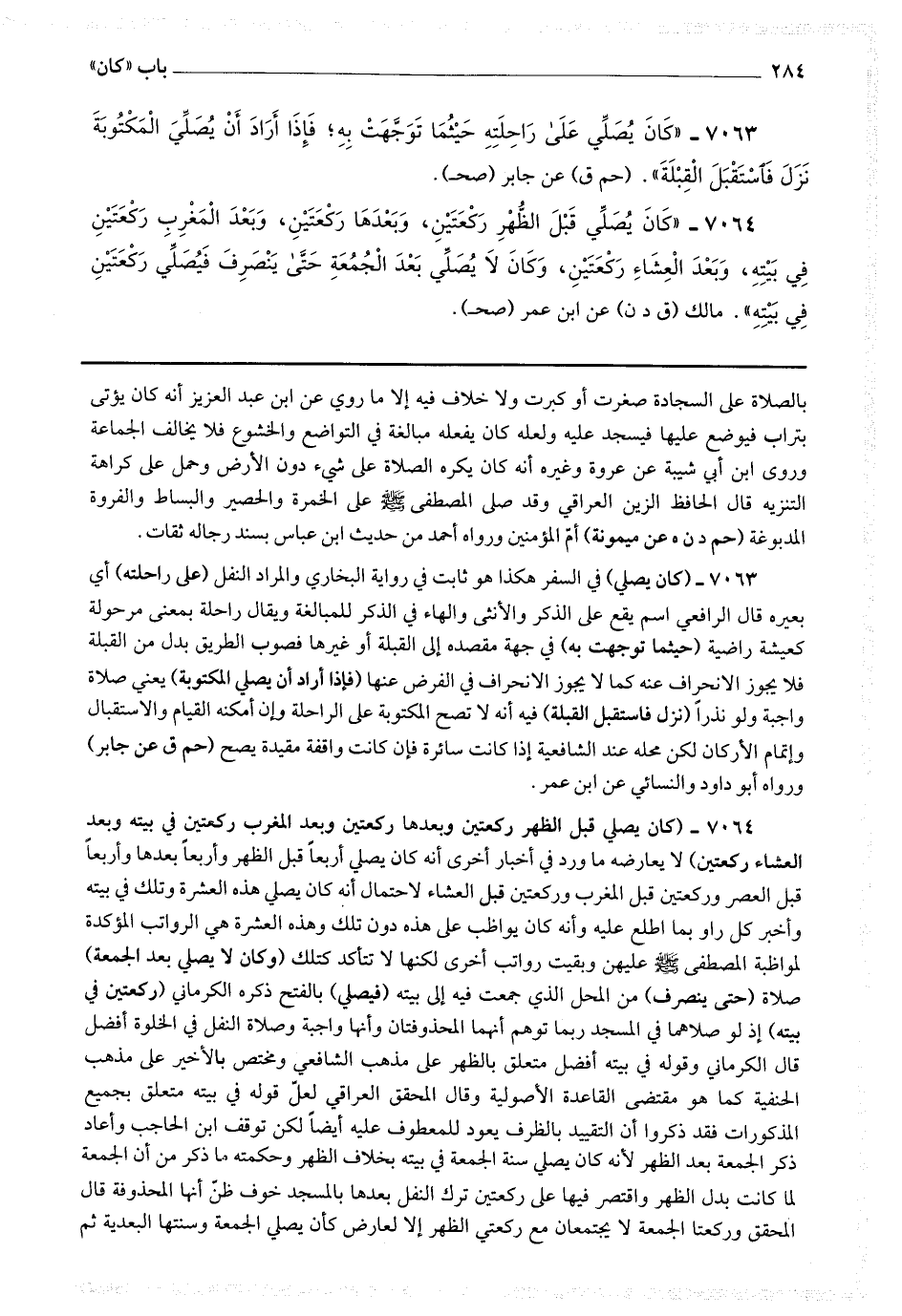 7064 - (كان يصلي قبل الظهر ركعتين وبعدها ركعتين وبعد المغرب ركعتين في بيته وبعد العشاء ركعتين) لا يعارضه ما ورد في أخبار أخرى أنه كان يصلي أربعا قبل الظهر وأربعا بعدها وأربعا قبل العصر وركعتين قبل المغرب وركعتين قبل العشاء لاحتمال أنه كان يصلي هذه العشرة وتلك في بيته وأخبر كل راو بما اطلع عليه وأنه كان يواظب على هذه دون تلك وهذه العشرة هي الرواتب المؤكدة لمواظبة المصطفى صلى الله عليه وسلم عليهن وبقيت رواتب أخرى لكنها لا تتأكد كتلك (وكان لا يصلي بعد الجمعة) صلاة (حتى ينصرف) من المحل الذي جمعت فيه إلى بيته (فيصلي) بالفتح ذكره الكرماني (ركعتين في بيته) إذ لو صلاهما في المسجد ربما توهم أنهما المحذوفتان وأنها واجبة وصلاة النفل في الخلوة أفضل قال الكرماني: وقوله في بيته أفضل متعلق بالظهر على مذهب الشافعية ومختص بالأخير على مذهب الحنفية كما هو مقتضى القاعدة الأصولية وقال المحقق العراقي: لعل قوله في بيته متعلق بجميع المذكورات فقد ذكروا أن التقييد بالظرف يعود للمعطوف عليه أيضا لكن توقف ابن الحاجب وأعاد ذكر الجمعة بعد الظهر لأنه كان يصلي سنة الجمعة في بيته بخلاف الظهر وحكمته ما ذكر من أن الجمعة لما كانت بدل الظهر واقتصر فيها على ركعتين ترك النفل بعدها بالمسجد خوف ظن أنها المحذوفة قال المحقق: وركعتا الجمعة لا يجتمعا مع ركعتي الظهر إلا لعارض كأن يصلي الجمعة وسنتها البعدية ثم