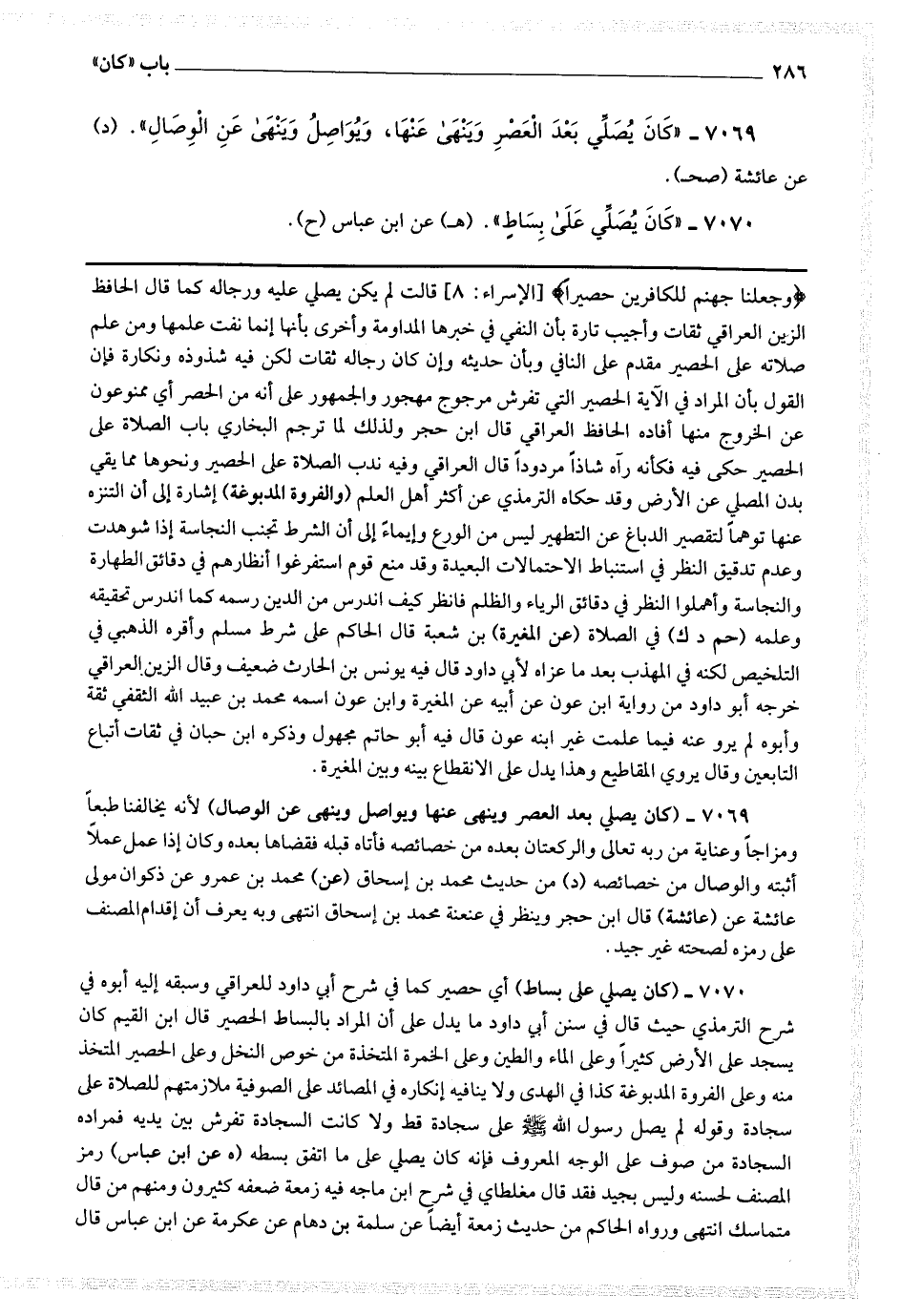 صلاته على الحصير مقدم على النافي بأن حديثه وإن كان رجاله ثقات لكن فيه شذوذ ونكارة فإن القول بأن المراد في الآية الحصير التي تفرش مرجوج مهجور والجمهور على أنه من الحصر أي ممنوعون عن الخروج منها أفاده الحافظ العراقي قال ابن حجر: ولذلك لما ترجم البخاري باب الصلاة على الحصير حكى فيه فكأنه رآه شاذا مردودا قال العراقى: وفيه ندب الصلاة على الحصير ونحوها مما يقي بدن المصلي عن الأرض وقد حكاه الترمذي عن أكثر أهل العلم (والفروة المدبوغة) إشارة إلى أن التنزه عنها توهما لتقصير الدباغ عن التطهير ليس من الورع وإيماءا إلى أن الشرط تجنب النجاسة إذا شوهدت وعدم تدقيق النظر في استنباط الاحتمالات البعيدة وقد منع قوم استفرغوا أنظارهم في دقائق الطهارة والنجاسة وأهملوا النظر في دقائق الرياء والظلم فانظر كيف اندرس من الدين رسمه كما اندرس تحقيقه وعلمه.