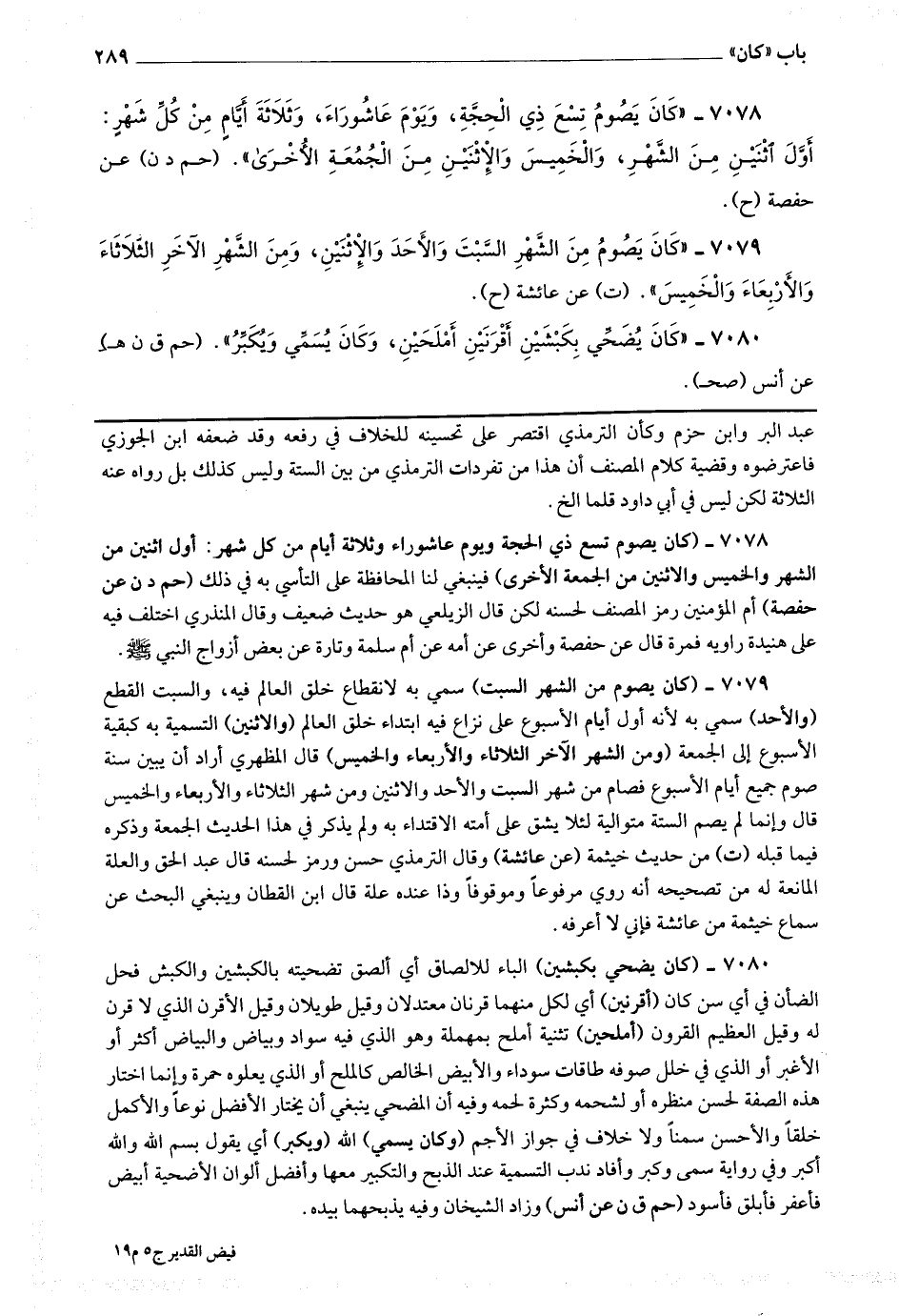 7078 - (كان يصوم تسع ذي الحجة ويوم عاشوراء وثلاثة أيام من كل شهر: أول اثنين من الشهر والخميس والاثنين من الجمعة الأخرى) فينبغي لنا المحافظة على التأسي به في ذلك.