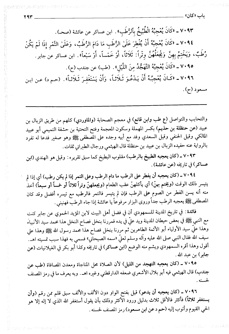 7094 - (كان يعجبه أن يفطر على الرطب ما دام الرطب وعلى التمر إذا لم يكن رطب) أي إذا لم يتيسر ذلك الوقت (ويختم بهن) أي يأكلهن عقب الطعام (ويجعلهن وترا ثلاثا أو خمسا أو سبعا) أخذ منه أنه يسن الفطر من الصوم على الرطب فإن لم يتيسر فالتمر فالرطب مع تيسره أفضل وقد كان المصطفى صلى الله عليه وسلم يعجبه الرطب جدا وروى البزار مرفوعا يا عائشة إذا جاء الرطب فهنيني.