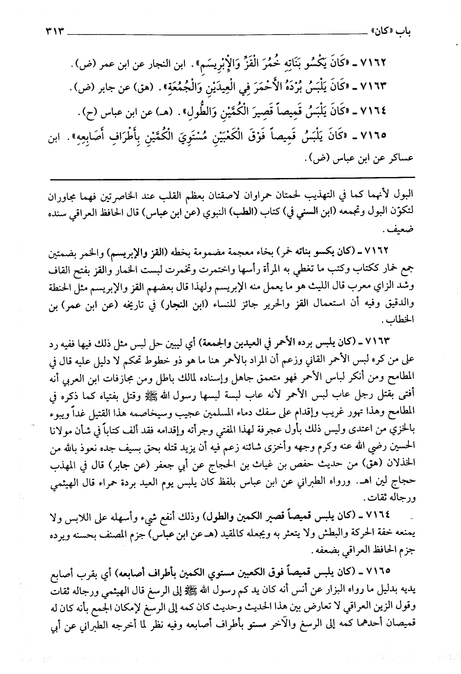 7164 - (كان يلبس قميصا قصير الكمين والطول) وذلك أنفع شئ وأسهله على اللابس ولا يمنعه خفة الحركة والبطش ولا يتعثر به ويجعله كالمقيد.