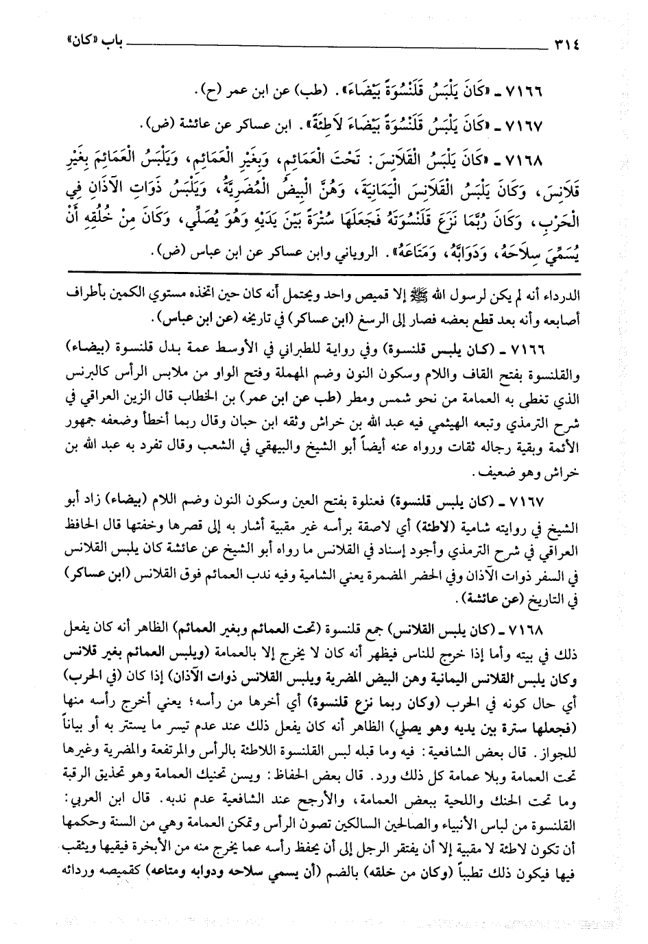 7168 - (كان يلبس القلانس) جمع قلنسوة (تحت العمائم وبغير العمائم) الظاهر أنه كان يفعل ذلك في بيته وأما إذا خرج [ص 247] للناس فيظهر أنه كان لا يخرج إلا بالعمامة (ويلبس العمائم بغير قلانس وكان يلبس القلانس اليمانية وهن البيض المضربة ويلبس القلانس ذوات الآذان) إذا كان (في الحرب) أي حال كونه في الحرب (وكان ربما نزع قلنسوة) أي أخرها من رأسه، يعني أخرج رأسه منها (فجعلها سترة بين يديه وهو يصلي) الظاهر أنه كان يفعل ذلك عند عدم تيسر ما يستتر به أو بيانا للجواز.