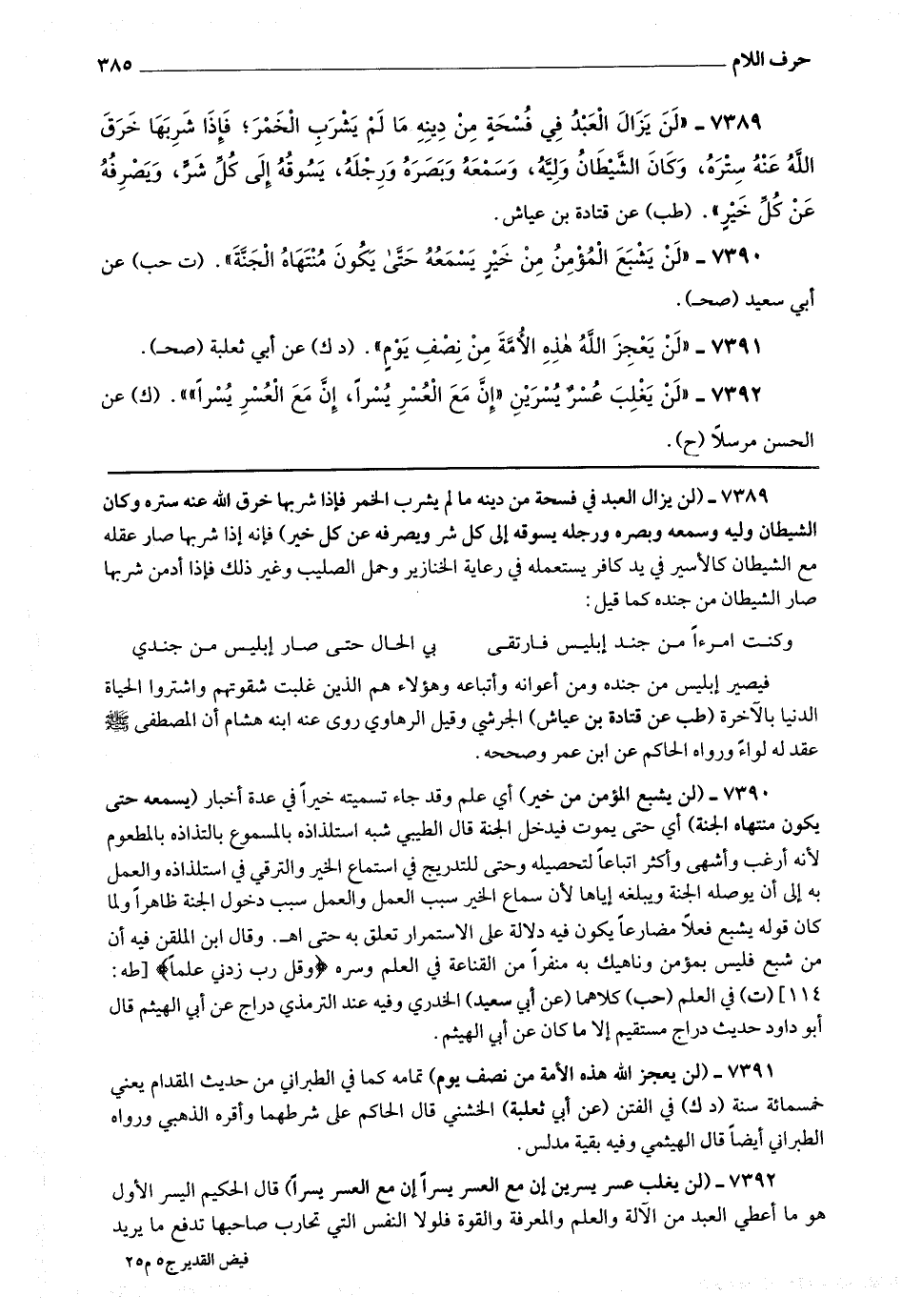 7392 - (لن يغلب عسر يسرين إن مع العسر يسرا إن مع العسر يسرا) قال الحكيم : اليسر الأول هو ما أعطي العبد من الآلة والعلم والمعرفة والقوة فلولا النفس التي تحارب صاحبها تدفع ما يريد