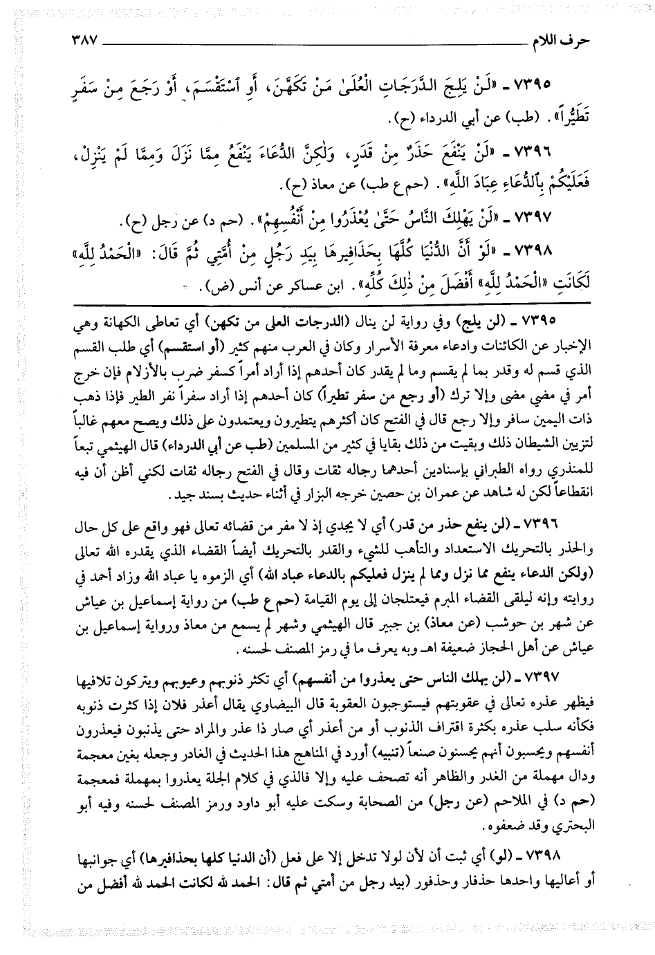 7396 - (لن ينفع حذر من قدر) أي لا يجدي إذ لا مفر من قضائه تعالى فهو واقع على كل حال والحذر بالتحريك الاستعداد والتأهب للشئ والقدر بالتحريك أيضا القضاء الذي يقدره الله تعالى (ولكن الدعاء ينفع مما نزل ومما لم ينزل فعليكم بالدعاء عباد الله) أي الزموه يا عباد الله وزاد أحمد في روايته وإنه ليلقى القضاء المبرم فيعتلجان إلى يوم القيامة.