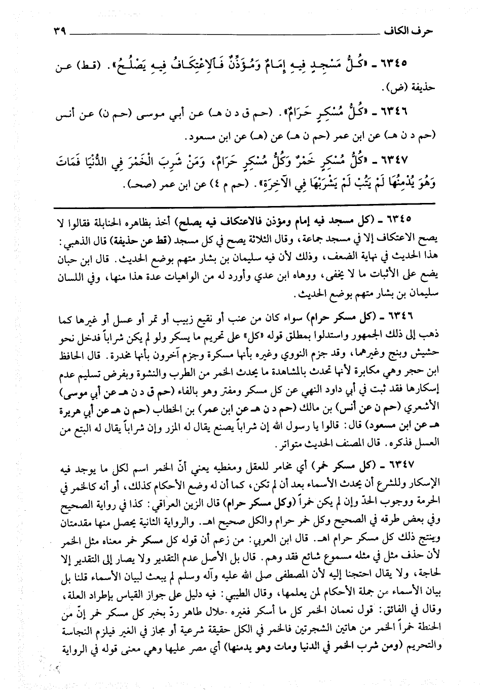 6346 - (كل مسكر حرام) سواء كان من عنب أو نقيع زبيب أو تمر أو عسل أو غيرها كما ذهب إلى ذلك الجمهور واستدلوا بمطلق قوله كل على تحريم ما يسكر ولو لم يكن شرابا فدخل نحو حشيش وبنج وغيرهما ، وقد جزم النووي وغيره بأنها مسكرة وجزم آخرون بأنها مخدرة.