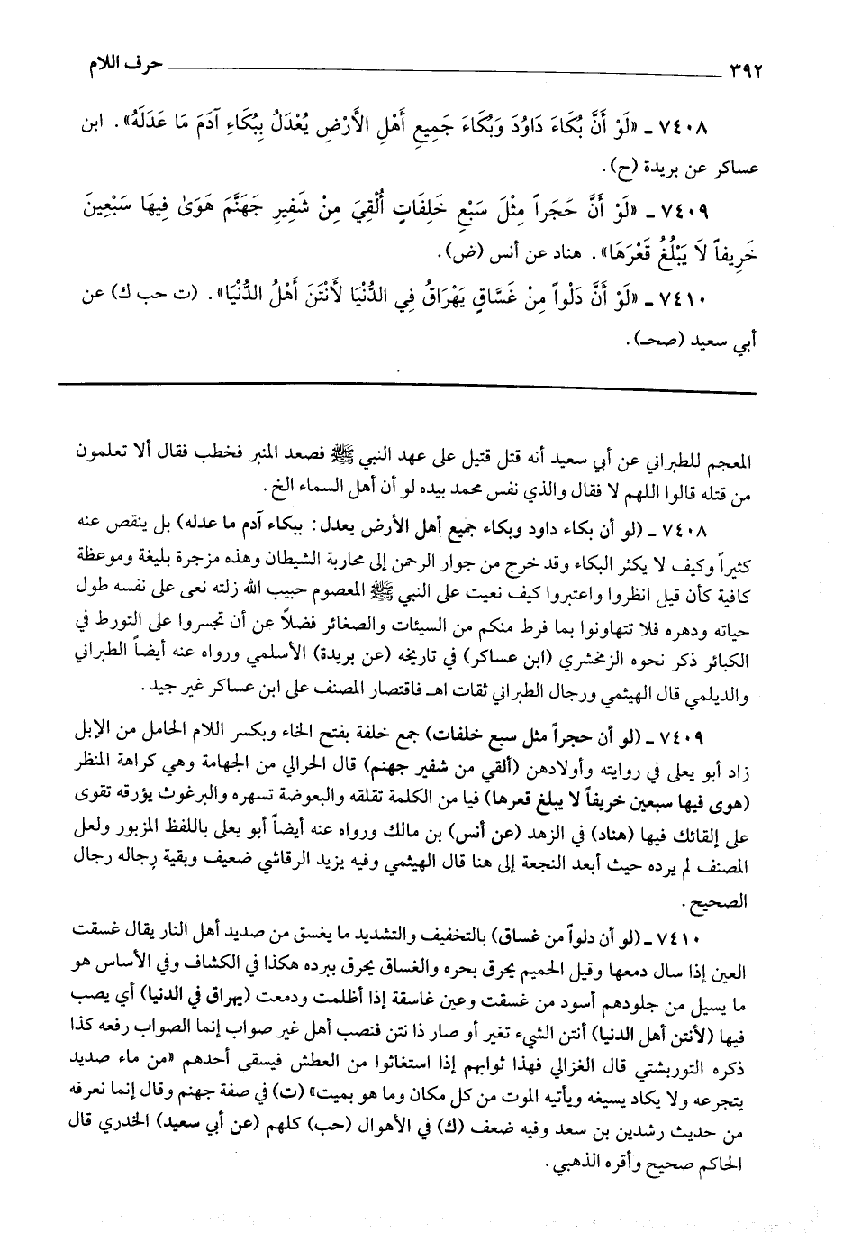 7409 - (لو أن حجرا مثل سبع خلفات) جمع خلقة بفتح الخاء وبكسر اللام الحامل من الابل زاد أبو يعلى في روايته وأولادهن (ألقى من شفير جهنم) قال الحرالي : من الجهامة وهي كراهة المنظر (هوى فيها سبعين خريفا لا يبلغ قعرها) فيا من الكلمة تقلقه والبعوضة تسهره والبرغوث يؤرقه تقوى على إلقائك فيها.