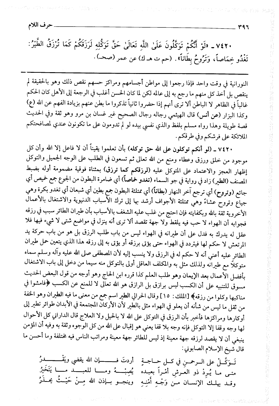 7420 - (لو أنكم توكلون على الله حق توكله) بأن تعلموا يقينا أن لا فاعل إلا الله وأن كل موجود من خلق ورزق وعطاء ومنع من الله تعالى ثم تسعون في الطلب على الوجه الجميل والتوكل إظهار العجز والاعتماد على المتوكل عليه (لرزقكم كما ترزق) بمثناة فوقية مضمومة أوله بضبط المصنف (الطير) زاد في رواية في جو السماء (تغدو خماصا) أي ضامرة البطون من الجوع جمع خميص أي