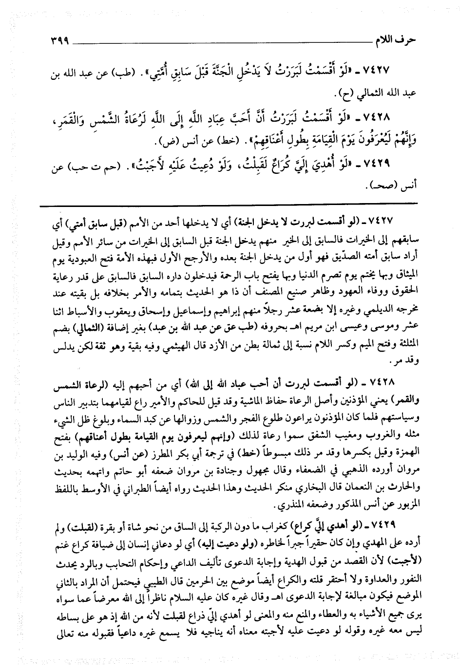 7428 - (لو أقسمت لبررت أن أحب عباد الله إلى الله) أي من أحبهم إليه (لرعاة الشمس والقمر) يعني المؤذنين وأصل الرعاة حفاظ الماشية وقد قيل للحاكم والأمير راع لقيامهما بتدبير الناس وسياستهم فلما كان المؤذنون يراعون طلوع الفجر والشمس وزوالها عن كبد السماء وبلوغ ظل الشئ مثله والغروب ومغيب الشفق سموا رعاة لذلك (وإنهم ليعرفون يوم القيامة بطول أعناقهم) بفتح الهمزة وقيل بكسرها وقد مر ذلك مبسوطا.