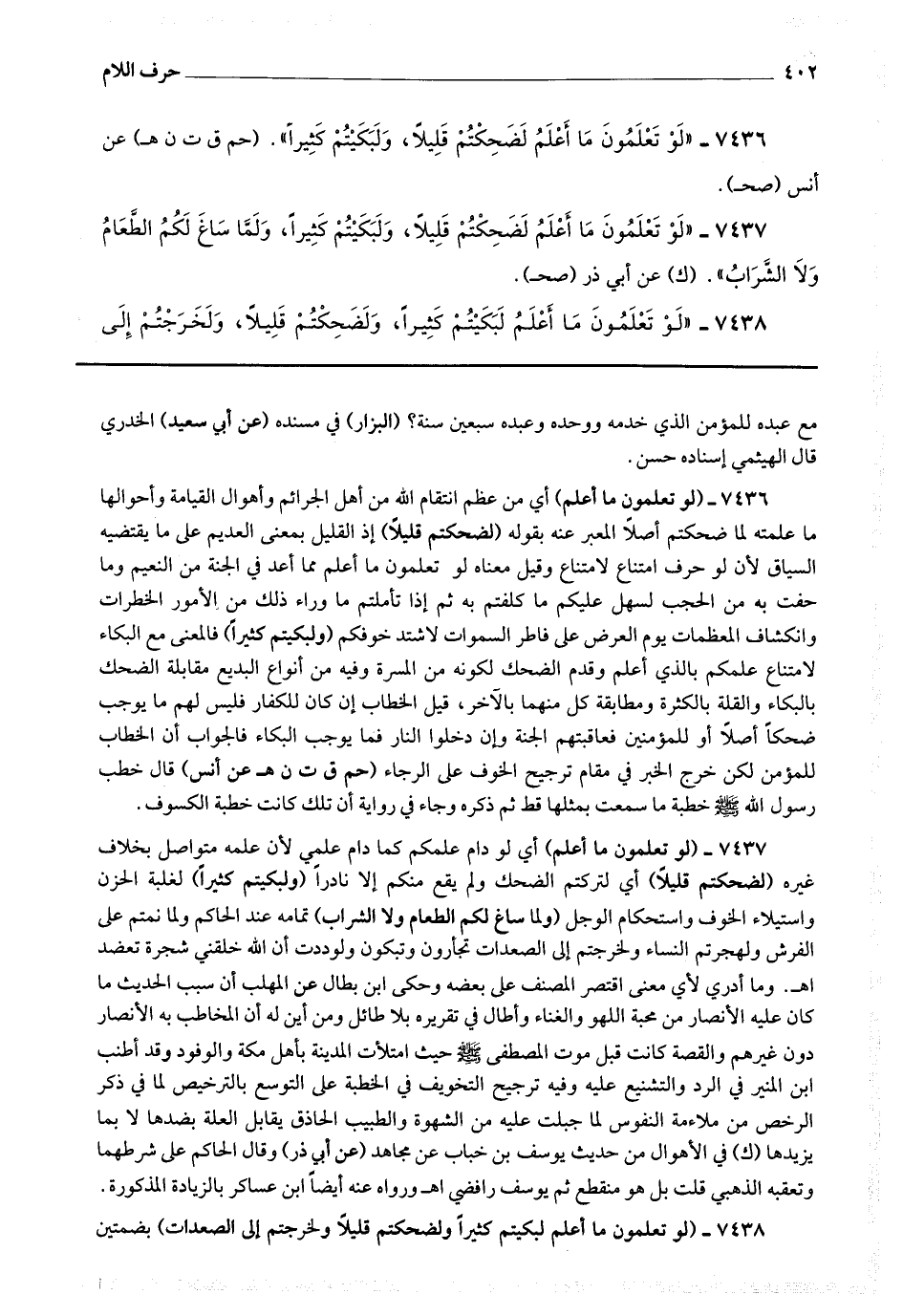7437 - (لو تعلمون ما أعلم) أي لو دام علمكم كما دام علمي لأن علمه متواصل بخلاف غيره (لضحكتم قليلا) أي لتركتم الضحك ولم يقع منكم إلا نادرا (ولبكيتم كثيرا) لغلبة الحزن واستيلاء الخوف واستحكام الوجل (ولما ساغ لكم الطعام ولا الشراب) تمامه عند الحاكم ولما نمتم على الفرش ولهجرتم النساء ولخرجتم إلى الصعدات تجأرون وتبكون ولوددت أن الله خلقني شجرة تعضد اه.