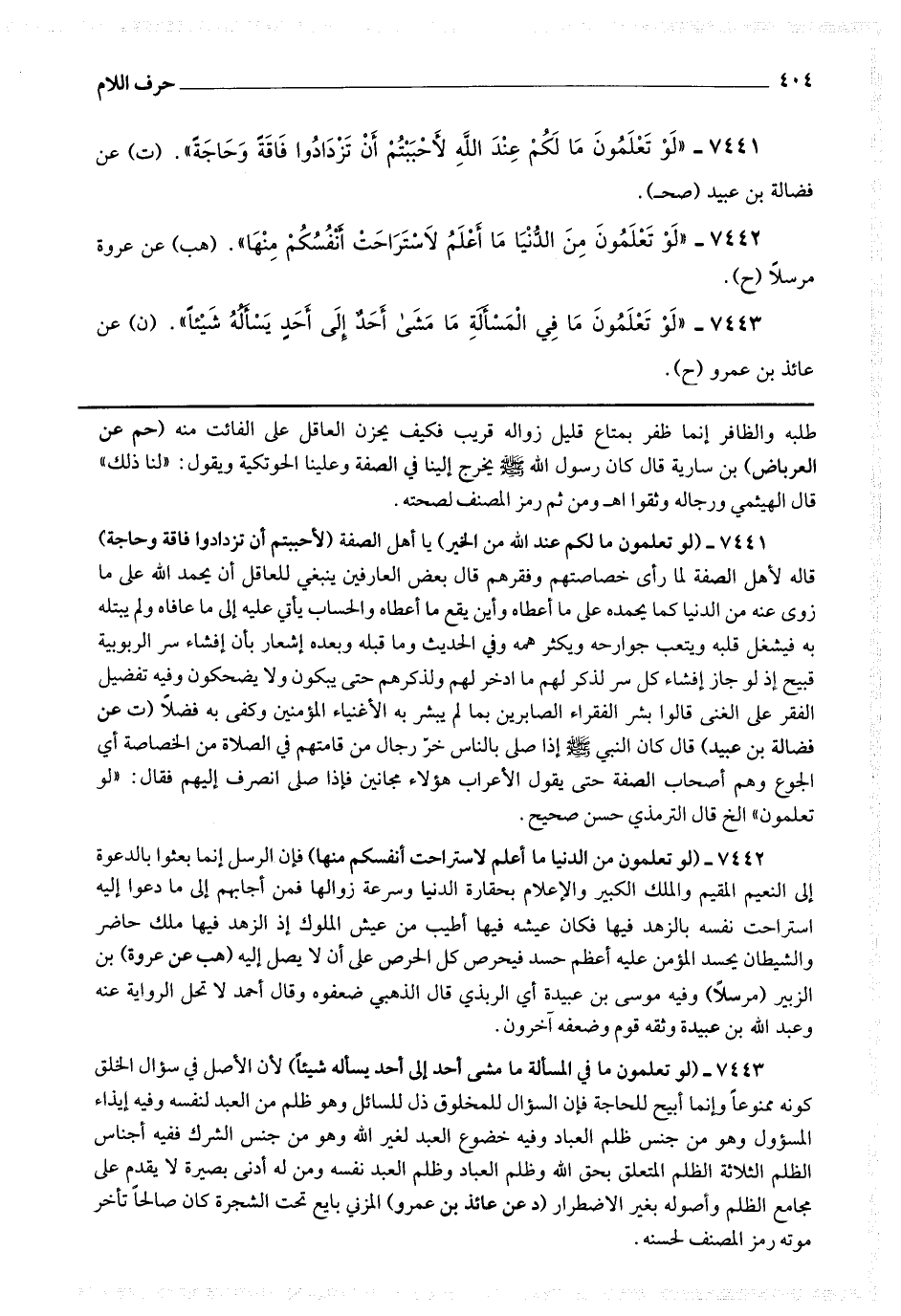 7443 - (لو تعلمون ما في المسألة ما مشى أحد إلى أحد يسأله شيئا) لأن الأصل في سؤال الخلق كونه ممنوعا وإنما أبيح [ ص 318 ] للحاجة فإن السؤال للمخلوق ذل للسائل وهو ظلم من العبد لنفسه وفيه إيذاء المسؤول وهو من جنس ظلم العباد وفيه خضوع العبد لغير الله وهو من جنس الشرك ففيه أجناس الظلم الثلاثة الظلم المتعلق بحق الله وظلم العباد وظلم العبد نفسه ومن له أدنى بصيرة لا يقدم على مجامع الظلم وأصوله بغير الاضطرار.