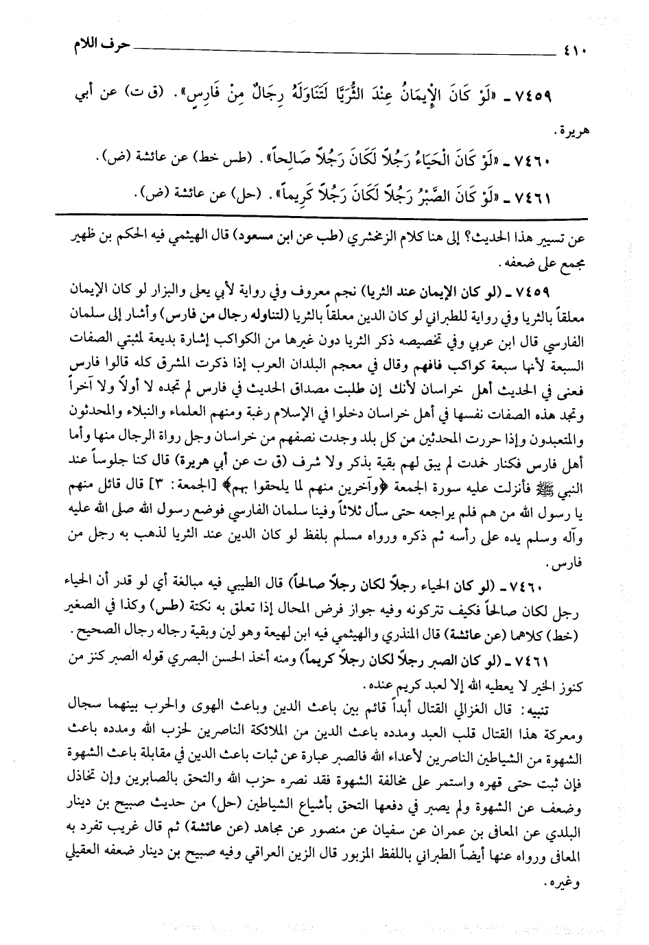 7459 - (لو كان الإيمان عند الثريا) نجم معروف وفي رواية لأبي يعلى والبزار لو كان الإيمان معلقا بالثريا وفي رواية للطبراني لو كان الدين معلقا بالثريا (لتناوله رجال من فارس) وأشار إلى سلمان الفارسي قال ابن عربي : وفي تخصيصه ذكر الثريا دون غيرها من الكواكب إشارة بديعة لمثبتي الصفات السبعة لأنها سبعة كواكب فاقهم وقال في معجم البلدان : العرب إذا ذكرت المشرق كله قالوا فارس فعنى في الحديث أهل خراسان لأنك إن طلبت مصداق الحديث في فارس لم تجده لا أولا ولا آخرا وتجد هذه الصفات نفسها في أهل خراسان دخلوا في الإسلام رغبة ومنهم العلماء والنبلاء والمحدثون والمتعبدون وإذا حررت المحدثين من كل بلد وجدت نصفهم من خراسان وجل رواة الرجال منها وأما أهل فارس فكنار خمدت لم يبق لهم بقية بذكر ولا شرف.