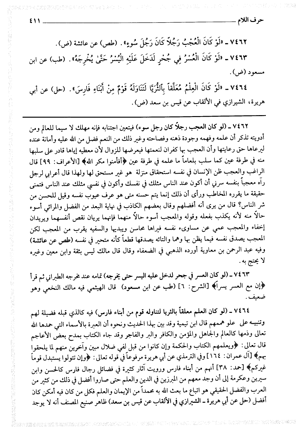 7464 - (لو كان العلم معلقا بالثريا لتناوله قوم من أبناء فارس) فيه كالذي قبله فضيلة لهم وتنبيه على علو هممهم قال ابن تيمية : وقد بين بهذا الحديث ونحوه أن العبرة بالأسماء إلى حمدها الله تعالى وذمها كالعالم والجاهل والمؤمن والكافر والبر والفاجر وقد جاء الكتاب بمدح بعض الأعاجم قال تعالى : * (ويعلمهم الكتاب والحكمة وإن كانوا من قبل لفي ضلال مبين وآخرين منهم لما يلحقوا بهم) * وفي الترمذي عن أبي هريرة مرفوعا في قوله تعالى * (وإن تتولوا يستبدل قوما غيركم) * أنهم من أبناء فارس ورويت آثار كثيرة في فضائل رجال فارس كالحسن وابن سيرين وعكرمة إلى أن وجد معهم من المبرزين في الدين والعلم حتى صاروا أفضل في ذلك من كثير من العرب والفضل الحقيقي هو اتباع ما بعث الله به محمدا من الإيمان والعلم فكل من كان فيه أمكن كان أفضل.