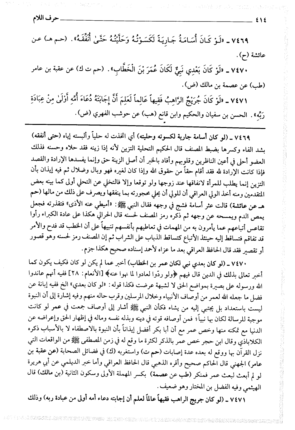 7470 - (لو كان بعدي نبي لكان عمر بن الخطاب) أخبر عما لم يكن لو كان فكيف يكون كما أخبر تعالى بذلك في الدين قال فيهم * (ولو ردوا لعادوا لما نهوا عنه) ففيه أنهم عائدوا الله ورسوله على بصيرة بمواضع الحق لا لشبهة عرضت فكذا قوله لو كان بعدي إلخ ففيه إبانة عن