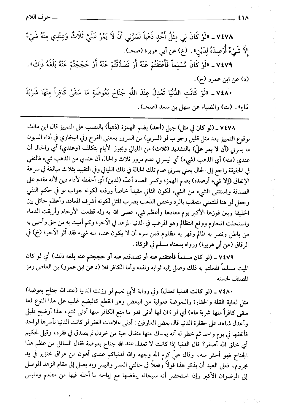 7478 - (لو كان لي مثل) جبل (أحد) بضم الهمزة (ذهبا) بالنصب على التمييز قال ابن مالك