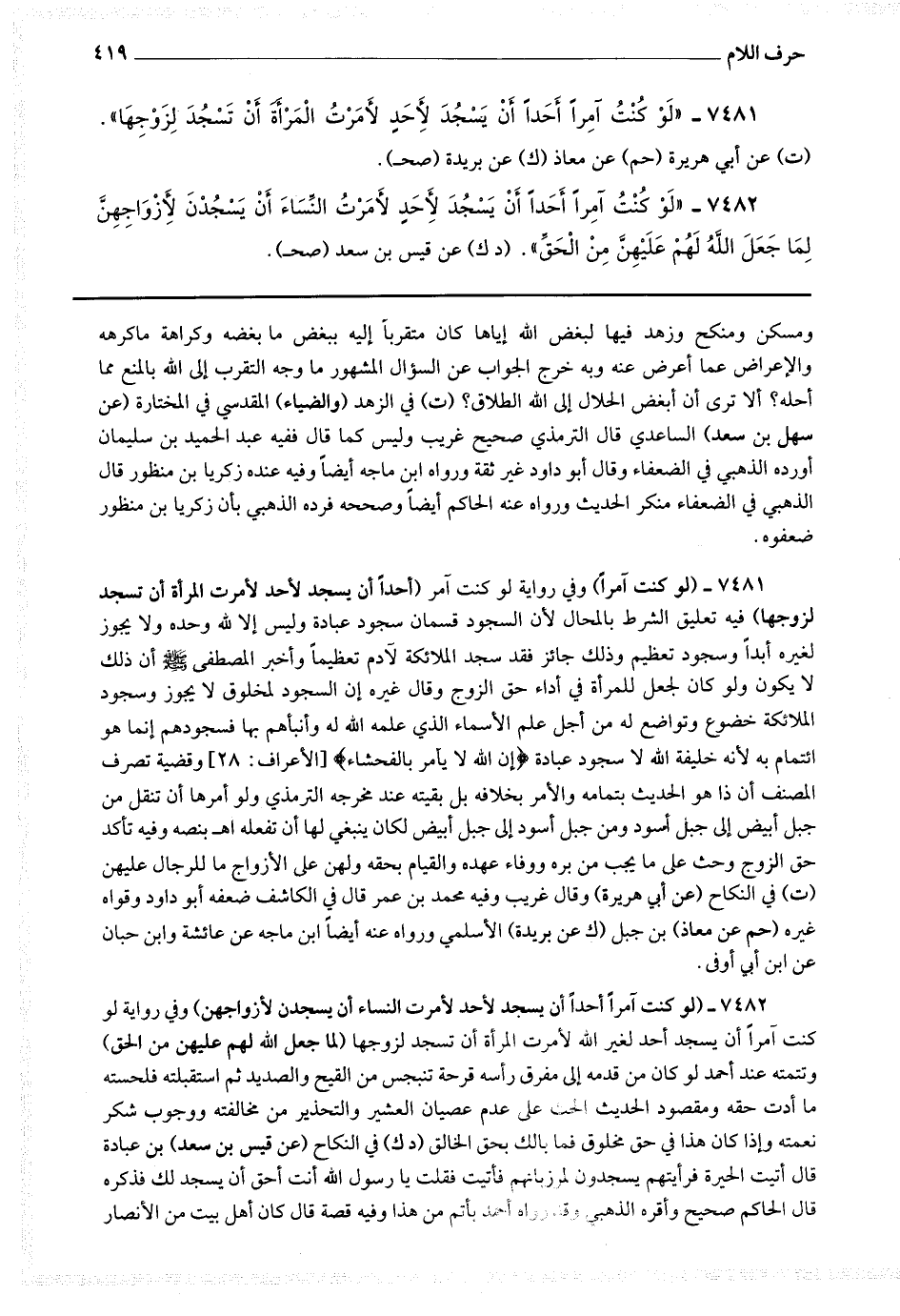 7482 - (لو كنت آمرا أحدا أن يسجد لأحد لأمرت النساء أن يسجدن لأزواجهن) وفي رواية لو