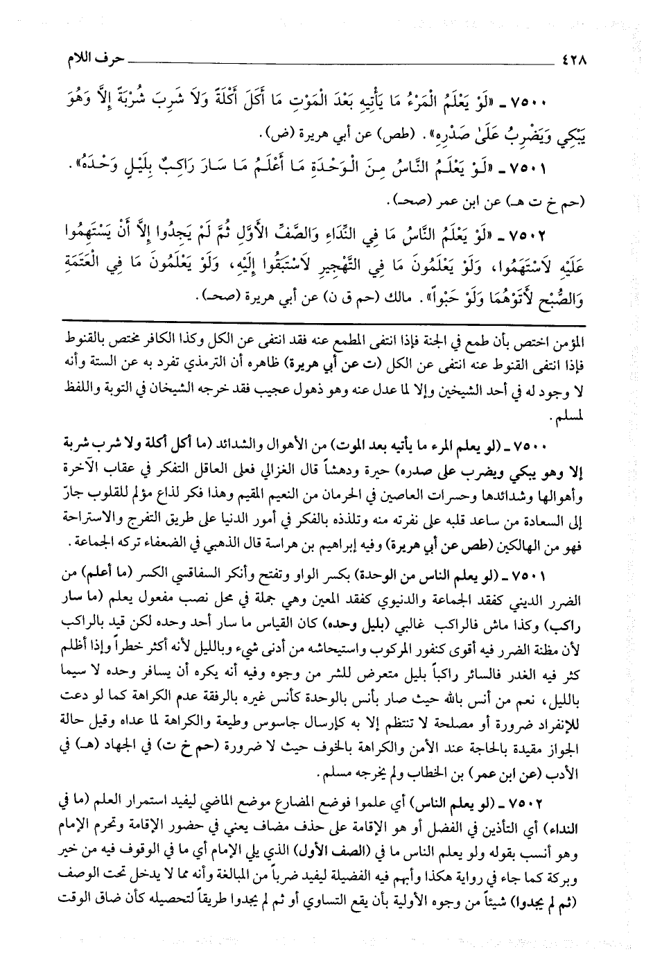 7500 - (لو يعلم المرء ما يأتيه بعد الموت) من الأهوال والشدائد (ما أكل أكلة ولا شرب شربة إلا وهو يبكي ويضرب على صدره) حيرة ودهشا قال الغزالي : فعلى العاقل التفكر في عقاب الآخرة وأهوالها وشدائدها وحسرات العاصين في الحرمان من النعيم المقيم وهذا فكر لذاع مؤلف للقلوب جار إلى السعادة ومن ساعد قلبه على نفرته منه وتلذذه بالفكر في أمور الدنيا على طريق التفرج والاستراحة فهو من الهالكين.