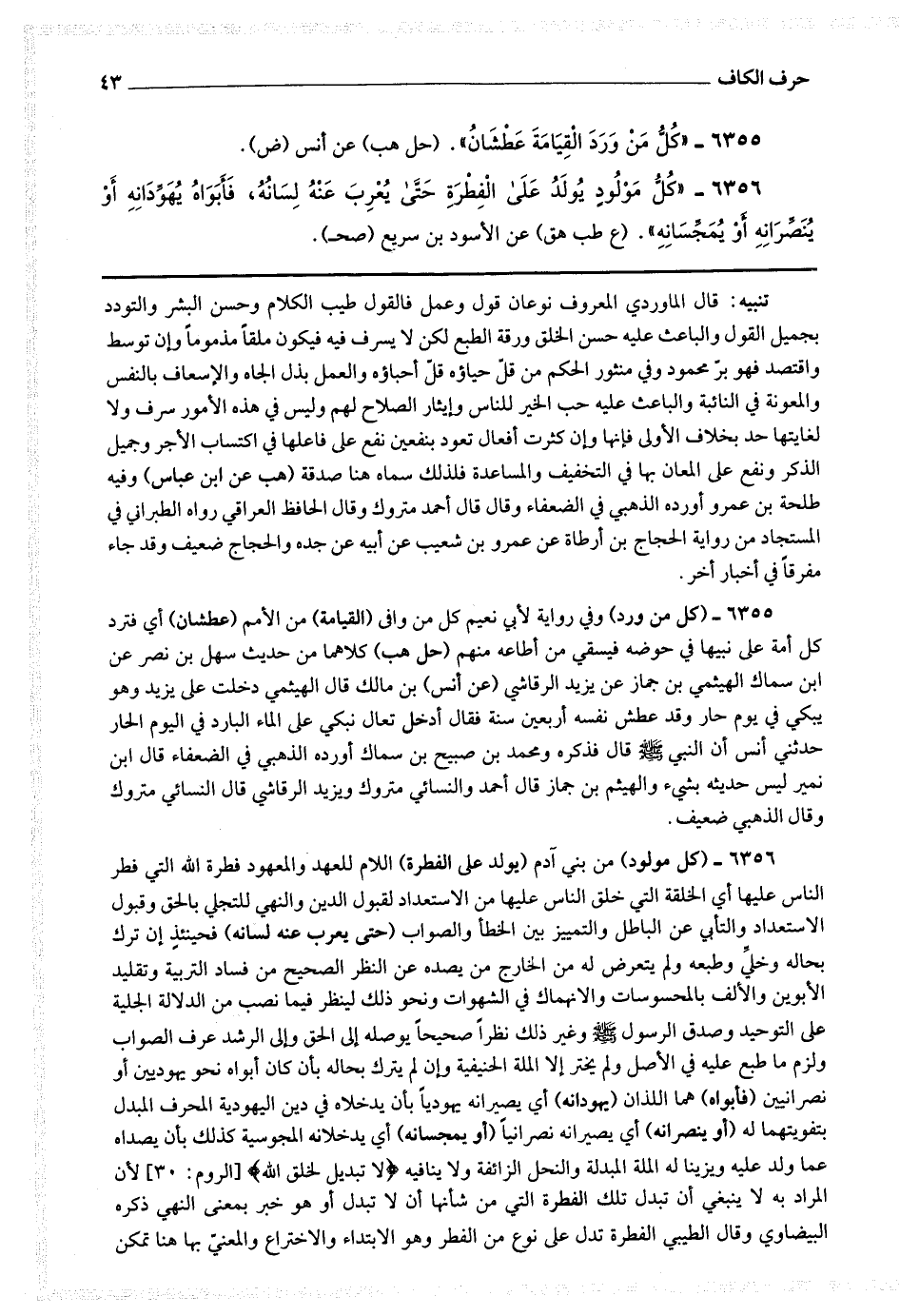 6356 - (كل مولود) من بني آدم (يولد على الفطرة) اللام للعهد والمعهود فطرة الله التي فطر الناس عليها أي الخلقة التي خلق الناس عليها من الاستعداد لقبول الدين والنهي لتتجلى بالحق وقبول الاستعداد والتأبي عن الباطل والتمييز بين الخطأ والصواب (حتى يعرب عنه لسانه) فحينئذ إن ترك بحاله وخلى وطبعه ولم يتعرض له من الخارج من يصده عن النظر الصحيح من فساد التربية وتقليد الأبوين والألف بالمحسوسات والانهماك في الشهوات ونحو ذلك لينظر فيما نصب من الدلالة الجلية على التوحيد وصدق الرسول صلى الله عليه وسلم وغير ذلك نظرا صحيحا يوصله إلى الحق وإلى الرشد عرف الصواب ولزم ما طبع عليه في الأصل ولم يختر إلا الملة الحنيفية وإن لم ينكر بحاله بأن كان أبواه نحو يهوديين أو نصرانيين (فأبواه) هما اللذان (يهودانه) أي يصيرانه يهوديا بأن يدخلاه في دين اليهودية المحرف المبدل بتفويتهما له (أو ينصرانه) أي يصيرانه نصرانيا (أو يمجسانه) أي يدخلانه المجوسية كذلك بأن يصداه